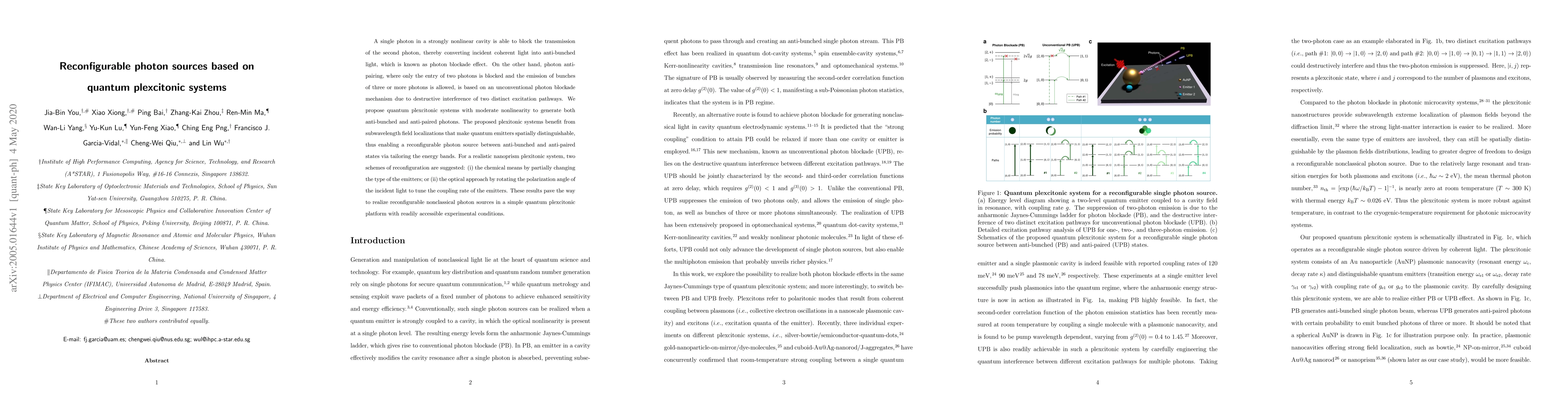 A single photon in a strongly nonlinear cavity is able to block the transmission of the second photon, thereby converting incident coherent light into anti-bunched light, which is known as photon blockade effect. On the other hand, photon anti-pairing, where only the entry of two photons is blocked and the emission of bunches of three or more photons is allowed, is based on an unconventional photon blockade mechanism due to destructive interference of two distinct excitation pathways. We propose quantum plexcitonic systems with moderate nonlinearity to generate both anti-bunched and anti-paired photons. The proposed plexitonic systems benefit from subwavelength field localizations that make quantum emitters spatially distinguishable, thus enabling a reconfigurable photon source between anti-bunched and anti-paired states via tailoring the energy bands. For a realistic nanoprism plexitonic system, two schemes of reconfiguration are suggested: (i) the chemical means by partially changing the type of the emitters; or (ii) the optical approach by rotating the polarization angle of the incident light to tune the coupling rate of the emitters. These results pave the way to realize reconfigurable nonclassical photon sources in a simple quantum plexcitonic platform with readily accessible experimental conditions.