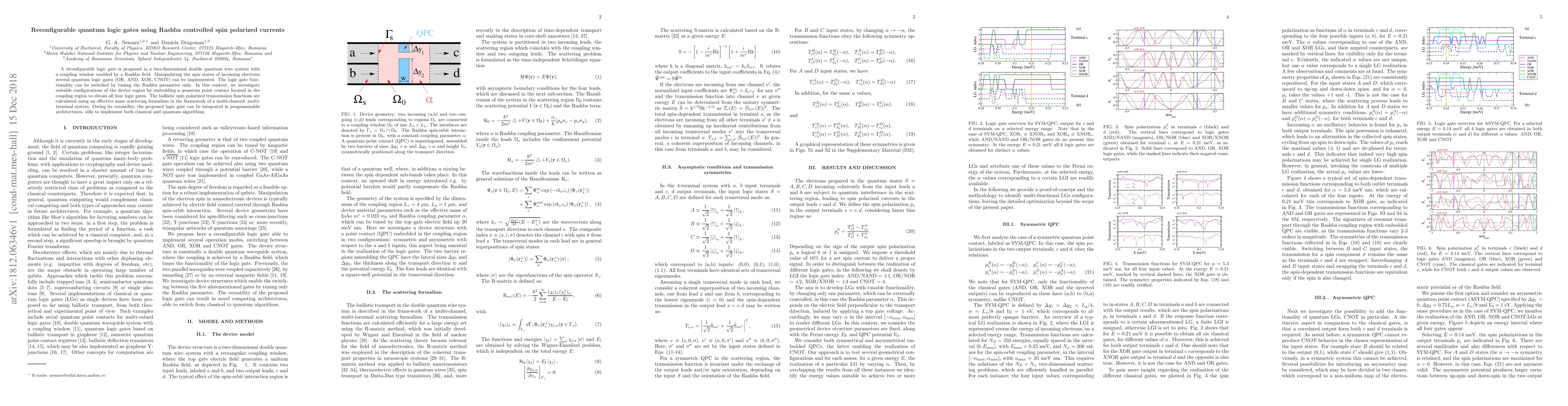 This paper proposes a reconfigurable quantum logic gate using Rashba spin-polarized currents in a double quantum wire system, enabling various quantum logic gates (OR, AND, XOR, CNOT) by tuning the Rashba parameter. The gate's versatility allows integration into programmable architectures for both classical and quantum algorithms.