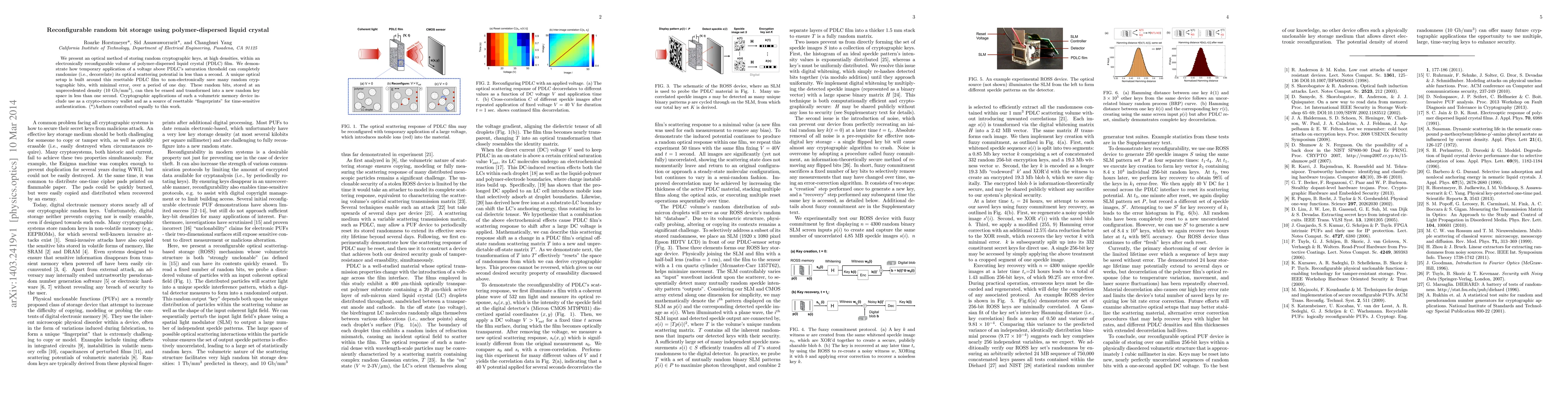 This paper introduces an optical method for high-density storage of random cryptographic keys using polymer-dispersed liquid crystal (PDLC) film, which can be reconfigured electronically. The PDLC film can rapidly randomize its optical properties, enabling the storage and erasure of random bits at unprecedented densities, with potential applications in crypto-currency and authentication.