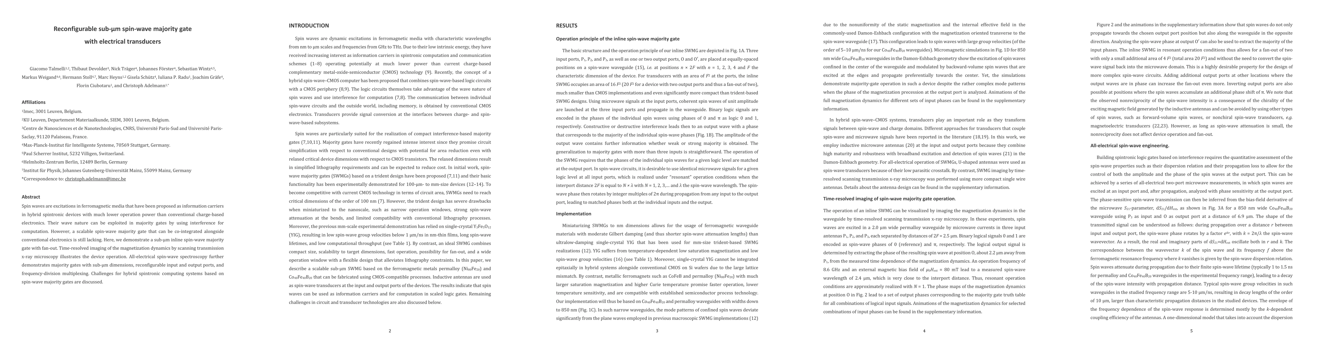 This paper presents a scalable sub-micron spin-wave majority gate integrated with electrical transducers, demonstrating its operation through time-resolved imaging and spin-wave spectroscopy. The device features reconfigurable ports and frequency-division multiplexing, addressing the need for low-power hybrid spintronic computing systems.