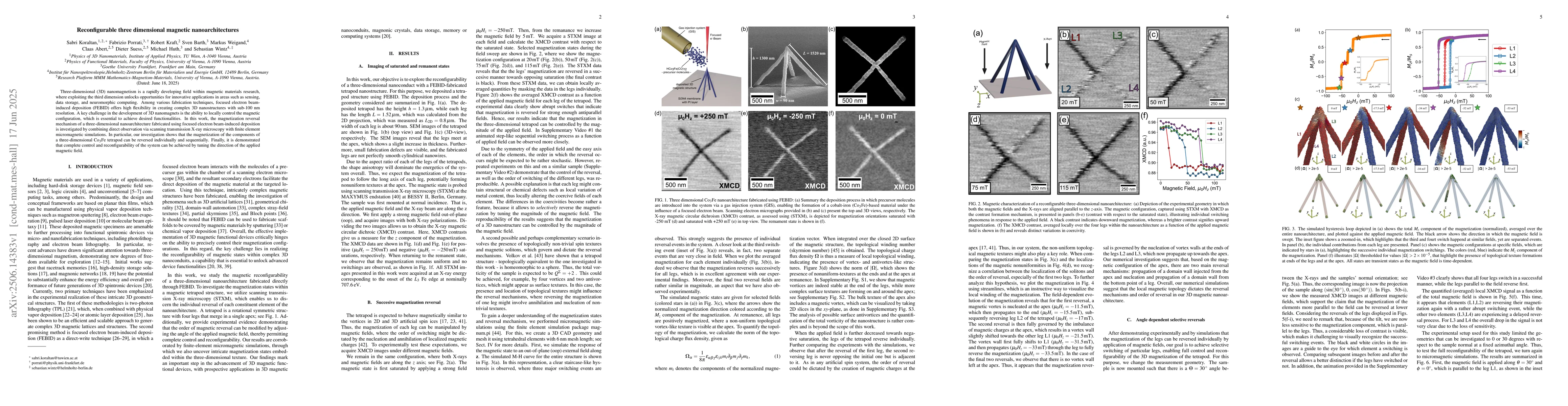 Three-dimensional (3D) nanomagnetism is a rapidly developing field within magnetic materials research, where exploiting the third dimension unlocks opportunities for innovative applications in areas such as sensing, data storage, and neuromorphic computing. Among various fabrication techniques, focused electron beam-induced deposition (FEBID) offers high flexibility in creating complex 3D nanostructures with sub-100 nm resolution. A key challenge in the development of 3D nanomagnets is the ability to locally control the magnetic configuration, which is essential to achieve desired functionalities. In this work, the magnetization reversal mechanism of a three-dimensional nanoarchitecture fabricated using focused electron beam-induced deposition is investigated by combining direct observation via scanning transmission X-ray microscopy with finite element micromagnetic simulations. In particular, our investigation shows that the magnetization of the components of a three-dimensional Co3 Fe tetrapod can be reversed individually and sequentially. Finally, it is demonstrated that complete control and reconfigurability of the system can be achieved by tuning the direction of the applied magnetic field.