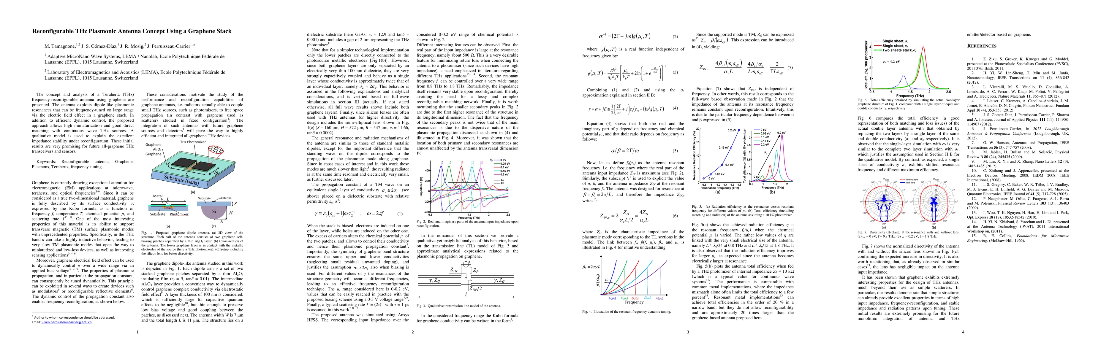 A THz reconfigurable antenna leveraging graphene stacks utilizes electric field effects for dynamic frequency tuning and achieves miniaturization while maintaining impedance stability, promising advancements in THz transceivers and sensors. The dipole-like plasmonic resonances in graphene enable efficient frequency adjustments over a broad range.