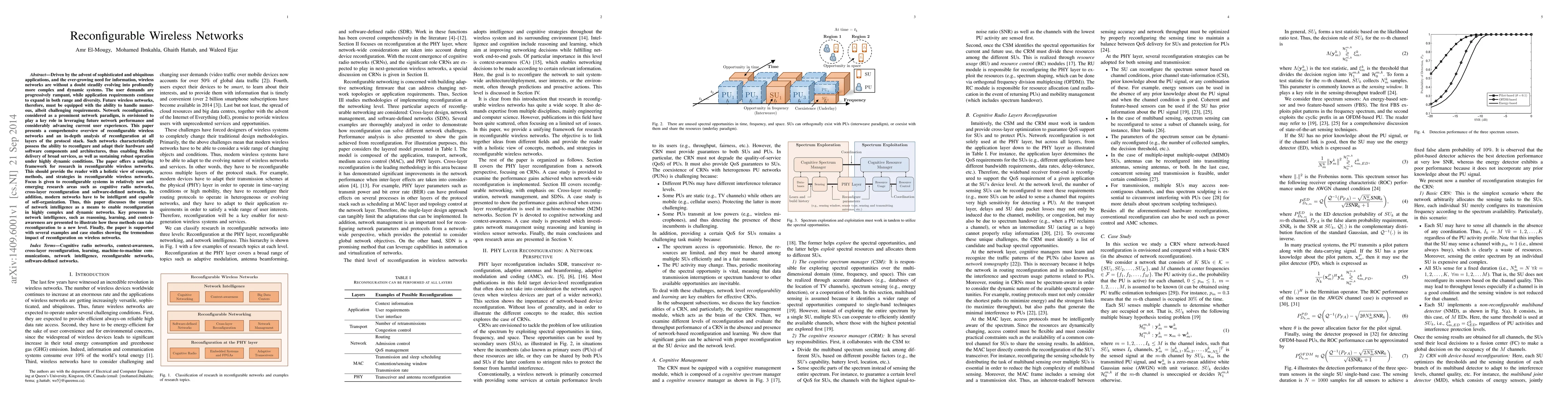 Driven by the advent of sophisticated and ubiquitous applications, and the ever-growing need for information, wireless networks are without a doubt steadily evolving into profoundly more complex and dynamic systems. The user demands are progressively rampant, while application requirements continue to expand in both range and diversity. Future wireless networks, therefore, must be equipped with the ability to handle numerous, albeit challenging requirements. Network reconfiguration, considered as a prominent network paradigm, is envisioned to play a key role in leveraging future network performance and considerably advancing current user experiences. This paper presents a comprehensive overview of reconfigurable wireless networks and an in-depth analysis of reconfiguration at all layers of the protocol stack. Such networks characteristically possess the ability to reconfigure and adapt their hardware and software components and architectures, thus enabling flexible delivery of broad services, as well as sustaining robust operation under highly dynamic conditions. The paper offers a unifying framework for research in reconfigurable wireless networks. This should provide the reader with a holistic view of concepts, methods, and strategies in reconfigurable wireless networks. Focus is given to reconfigurable systems in relatively new and emerging research areas such as cognitive radio networks, cross-layer reconfiguration and software-defined networks. In addition, modern networks have to be intelligent and capable of self-organization. Thus, this paper discusses the concept of network intelligence as a means to enable reconfiguration in highly complex and dynamic networks. Finally, the paper is supported with several examples and case studies showing the tremendous impact of reconfiguration on wireless networks.