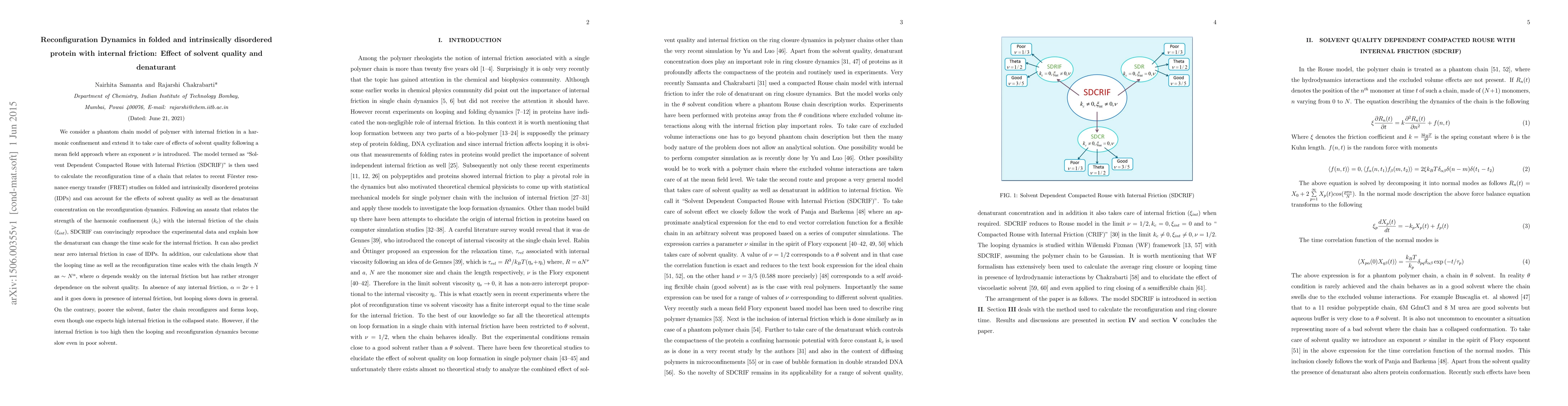 We consider a phantom chain model of polymer with internal friction in a harmonic confinement and extend it to take care of effects of solvent quality following a mean field approach where an exponent $\nu$ is introduced. The model termed as "Solvent Dependent Compacted Rouse with Internal Friction (SDCRIF)" is then used to calculate the reconfiguration time of a chain that relates to recent F\"{o}rster resonance energy transfer (FRET) studies on folded and intrinsically disordered proteins (IDPs) and can account for the effects of solvent quality as well as the denaturant concentration on the reconfiguration dynamics. Following an ansatz that relates the strength of the harmonic confinement ($k_c$) with the internal friction of the chain ($\xi_{int}$), SDCRIF can convincingly reproduce the experimental data and explain how the denaturant can change the time scale for the internal friction. It can also predict near zero internal friction in case of IDPs. In addition, our calculations show that the looping time as well as the reconfiguration time scales with the chain length $N$ as $\sim N^\alpha$, where $\alpha$ depends weakly on the internal friction but has rather stronger dependence on the solvent quality. In absence of any internal friction, $\alpha=2\nu+1$ and it goes down in presence of internal friction, but looping slows down in general. On the contrary, poorer the solvent, faster the chain reconfigures and forms loop, even though one expects high internal friction in the collapsed state. However, if the internal friction is too high then the looping and reconfiguration dynamics become slow even in poor solvent.