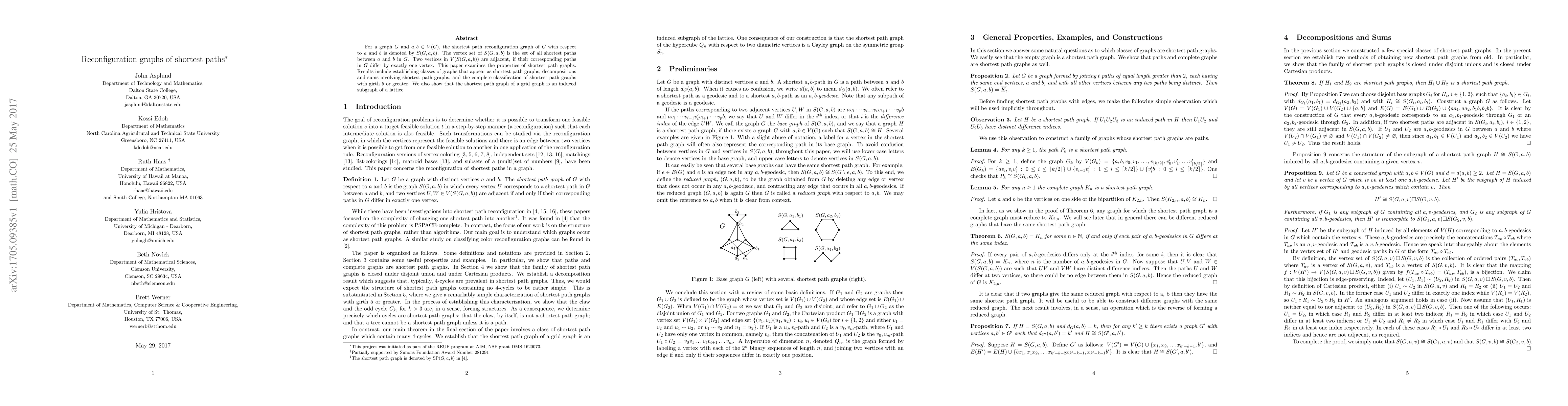 This paper investigates the properties of shortest path reconfiguration graphs, classifying certain types of graphs that can be represented as such and providing decompositions and sums involving these graphs. It also classifies shortest path graphs with girth 5 or greater and demonstrates that the shortest path graph of a grid graph is an induced subgraph of a lattice.