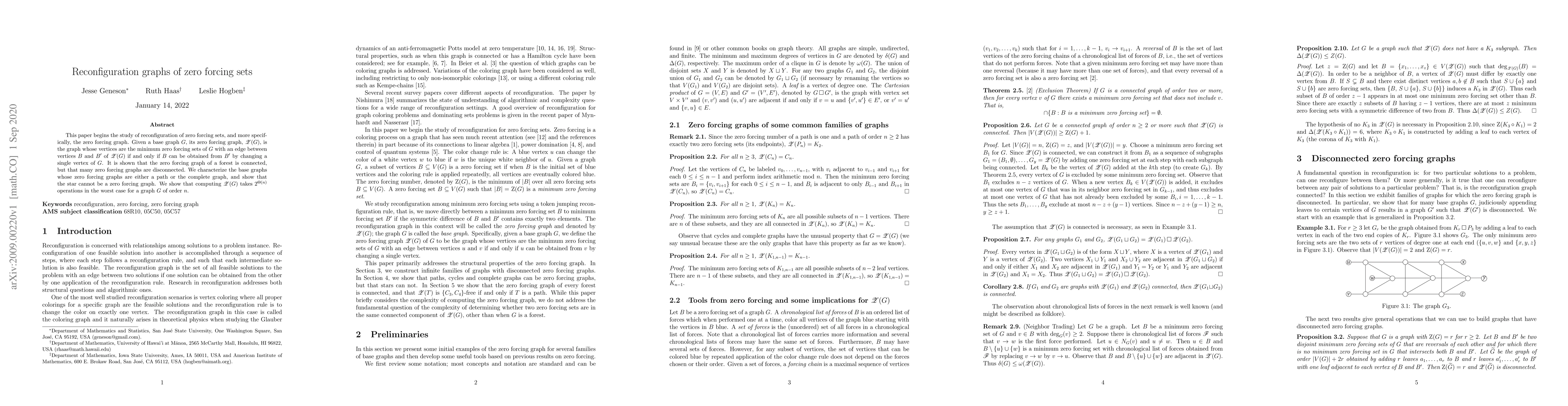 This paper explores the reconfiguration of zero forcing sets in graphs, introducing the zero forcing graph $\mathscr{Z}(G)$ and proving its connectivity for forests, while noting its frequent disconnection in general cases. It characterizes base graphs leading to path or complete zero forcing graphs and concludes that computing $\mathscr{Z}(G)$ requires $2^{\Theta(n)}$ operations in the worst case.