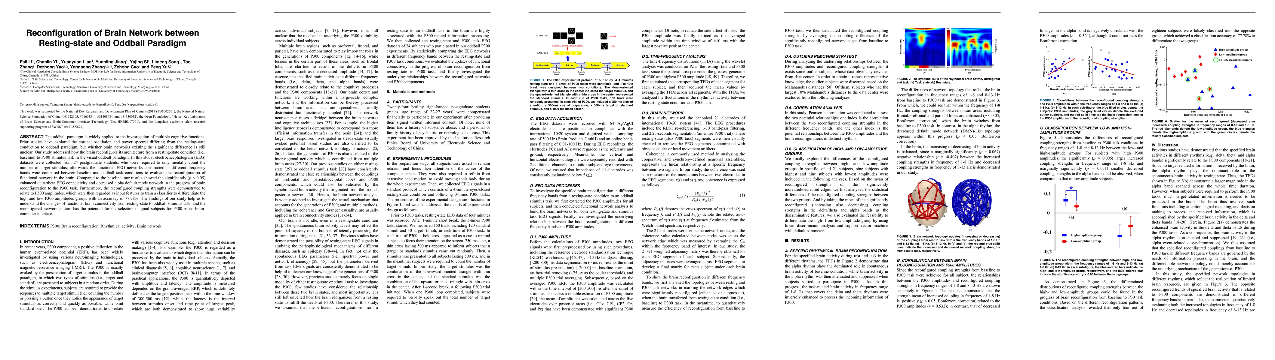 The oddball paradigm is widely applied to the investigation of multiple cognitive functions. Prior studies have explored the cortical oscillation and power spectral differing from the resting-state conduction to oddball paradigm, but whether brain networks existing the significant difference is still unclear. Our study addressed how the brain reconfigures its architecture from a resting-state condition (i.e., baseline) to P300 stimulus task in the visual oddball paradigm. In this study, electroencephalogram (EEG) datasets were collected from 24 postgraduate students, who were required to only mentally count the number of target stimulus; afterwards the functional EEG networks constructed in different frequency bands were compared between baseline and oddball task conditions to evaluate the reconfiguration of functional network in the brain. Compared to the baseline, our results showed the significantly (p < 0.05) enhanced delta/theta EEG connectivity and decreased alpha default mode network in the progress of brain reconfiguration to the P300 task. Furthermore, the reconfigured coupling strengths were demonstrated to relate to P300 amplitudes, which were then regarded as input features to train a classifier to differentiate the high and low P300 amplitudes groups with an accuracy of 77.78%. The findings of our study help us to understand the changes of functional brain connectivity from resting-state to oddball stimulus task, and the reconfigured network pattern has the potential for the selection of good subjects for P300-based brain- computer interface.