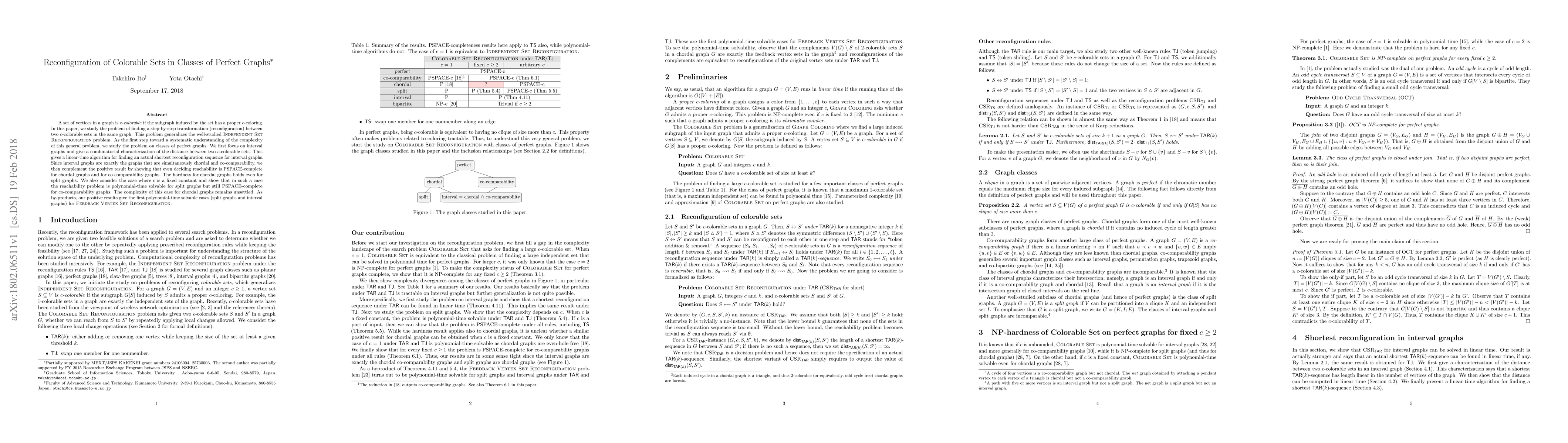 A set of vertices in a graph is c-colorable if the subgraph induced by the set has a proper c-coloring. In this paper, we study the problem of finding a step-by-step transformation (reconfiguration) between two c-colorable sets in the same graph. This problem generalizes the well-studied Independent Set Reconfiguration problem. As the first step toward a systematic understanding of the complexity of this general problem, we study the problem on classes of perfect graphs. We first focus on interval graphs and give a combinatorial characterization of the distance between two c-colorable sets. This gives a linear-time algorithm for finding an actual shortest reconfiguration sequence for interval graphs. Since interval graphs are exactly the graphs that are simultaneously chordal and co-comparability, we then complement the positive result by showing that even deciding reachability is PSPACE-complete for chordal graphs and for co-comparability graphs. The hardness for chordal graphs holds even for split graphs. We also consider the case where c is a fixed constant and show that in such a case the reachability problem is polynomial-time solvable for split graphs but still PSPACE-complete for co-comparability graphs. The complexity of this case for chordal graphs remains unsettled. As by-products, our positive results give the first polynomial-time solvable cases (split graphs and interval graphs) for Feedback Vertex Set Reconfiguration.