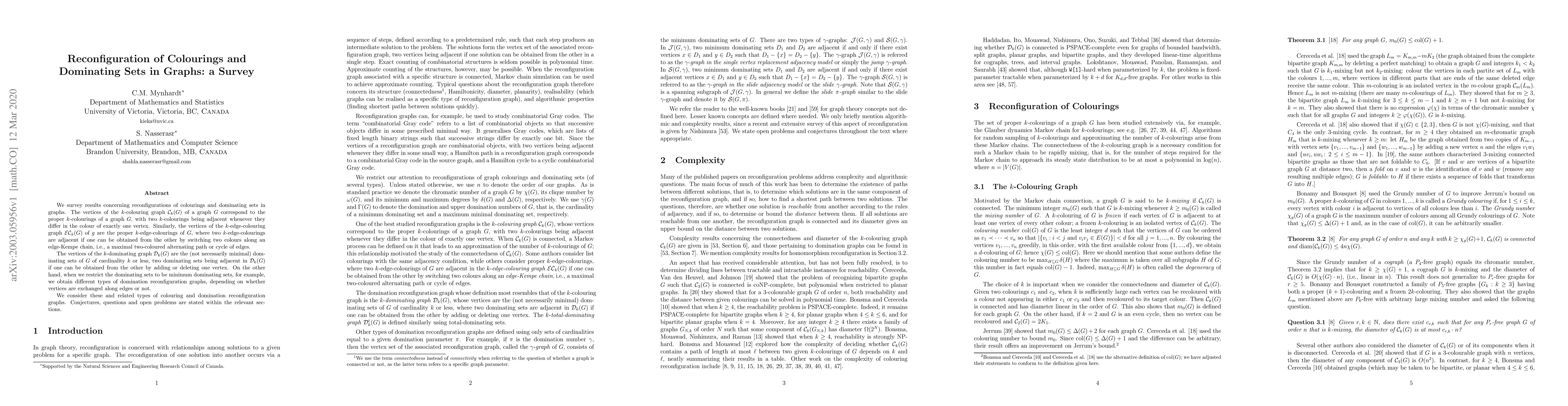 This paper surveys results on reconfigurations of colourings and dominating sets in graphs, exploring how different configurations can transform into one another. It focuses on the reconfiguration graphs for $k$-colourings, $k$-edge-colourings, and dominating sets, discussing adjacency criteria and open problems related to these structures.
