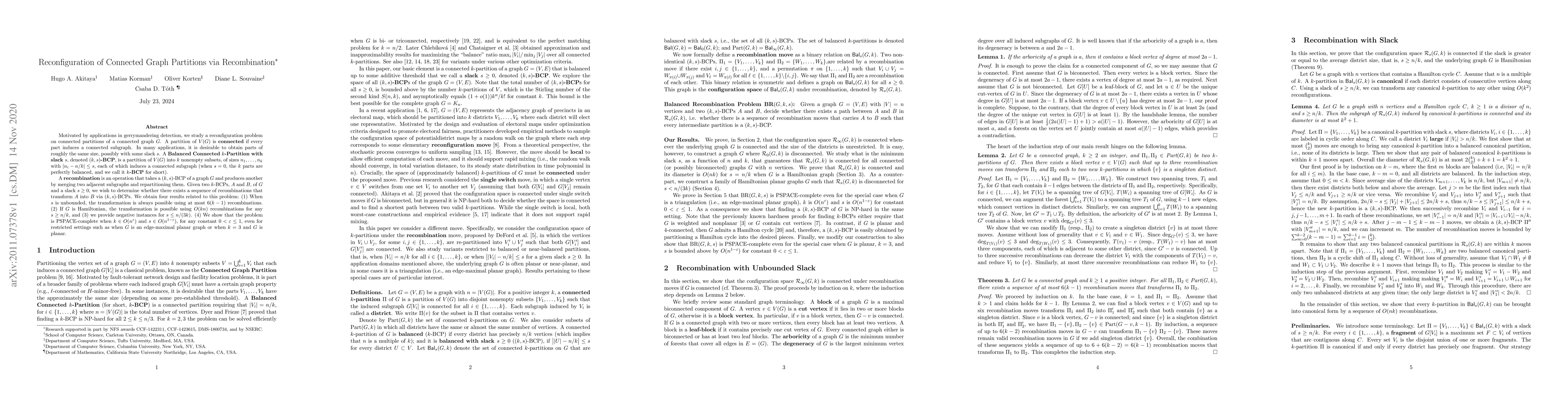 Motivated by applications in gerrymandering detection, we study a reconfiguration problem on connected partitions of a connected graph $G$. A partition of $V(G)$ is \emph{connected} if every part induces a connected subgraph. In many applications, it is desirable to obtain parts of roughly the same size, possibly with some slack $s$. A \emph{Balanced Connected $k$-Partition with slack $s$}, denoted \emph{$(k,s)$-BCP}, is a partition of $V(G)$ into $k$ nonempty subsets, of sizes $n_1,\ldots , n_k$ with $|n_i-n/k|\leq s$, each of which induces a connected subgraph (when $s=0$, the $k$ parts are perfectly balanced, and we call it \emph{$k$-BCP} for short). A \emph{recombination} is an operation that takes a $(k,s)$-BCP of a graph $G$ and produces another by merging two adjacent subgraphs and repartitioning them. Given two $k$-BCPs, $A$ and $B$, of $G$ and a slack $s\geq 0$, we wish to determine whether there exists a sequence of recombinations that transform $A$ into $B$ via $(k,s)$-BCPs. We obtain four results related to this problem: (1) When $s$ is unbounded, the transformation is always possible using at most $6(k-1)$ recombinations. (2) If $G$ is Hamiltonian, the transformation is possible using $O(kn)$ recombinations for any $s \ge n/k$, and (3) we provide negative instances for $s \leq n/(3k)$. (4) We show that the problem is PSPACE-complete when $k \in O(n^{\varepsilon})$ and $s \in O(n^{1-\varepsilon})$, for any constant $0 < \varepsilon \le 1$, even for restricted settings such as when $G$ is an edge-maximal planar graph or when $k=3$ and $G$ is planar.