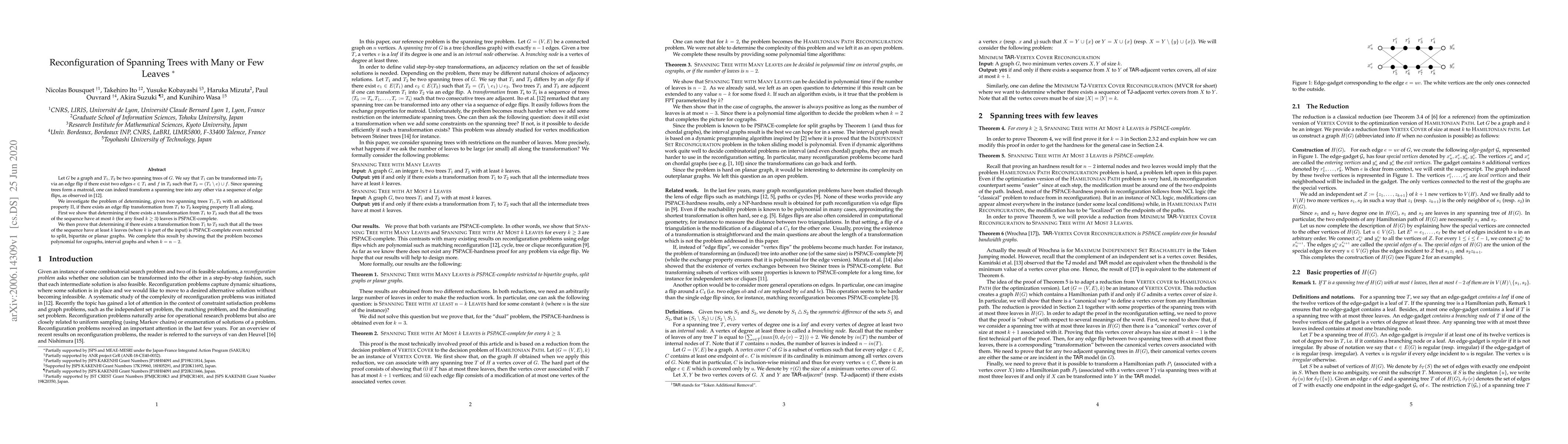 The paper establishes PSPACE-completeness results for reconfiguration of spanning trees with leaf constraints, providing a comprehensive analysis for various graph types.