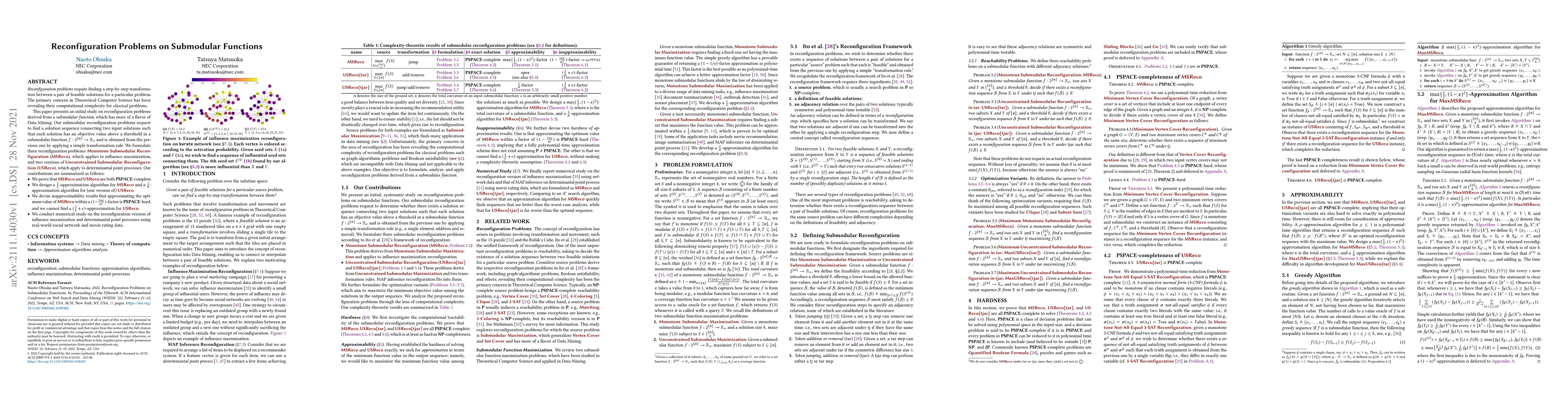 Reconfiguration problems require finding a step-by-step transformation between a pair of feasible solutions for a particular problem. The primary concern in Theoretical Computer Science has been revealing their computational complexity for classical problems. This paper presents an initial study on reconfiguration problems derived from a submodular function, which has more of a flavor of Data Mining. Our submodular reconfiguration problems request to find a solution sequence connecting two input solutions such that each solution has an objective value above a threshold in a submodular function $f: 2^{[n]} \to \mathbb{R}_+$ and is obtained from the previous one by applying a simple transformation rule. We formulate three reconfiguration problems: Monotone Submodular Reconfiguration (MSReco), which applies to influence maximization, and two versions of Unconstrained Submodular Reconfiguration (USReco), which apply to determinantal point processes. Our contributions are summarized as follows: 1. We prove that MSReco and USReco are both $\mathsf{PSPACE}$-complete. 2. We design a $\frac{1}{2}$-approximation algorithm for MSReco and a $\frac{1}{n}$-approximation algorithm for (one version of) USReco. 3. We devise inapproximability results that approximating the optimum value of MSReco within a $(1-\frac{1+\epsilon}{n^2})$-factor is $\mathsf{PSPACE}$-hard, and we cannot find a $(\frac{5}{6}+\epsilon)$-approximation for USReco. 4. We conduct numerical study on the reconfiguration version of influence maximization and determinantal point processes using real-world social network and movie rating data.