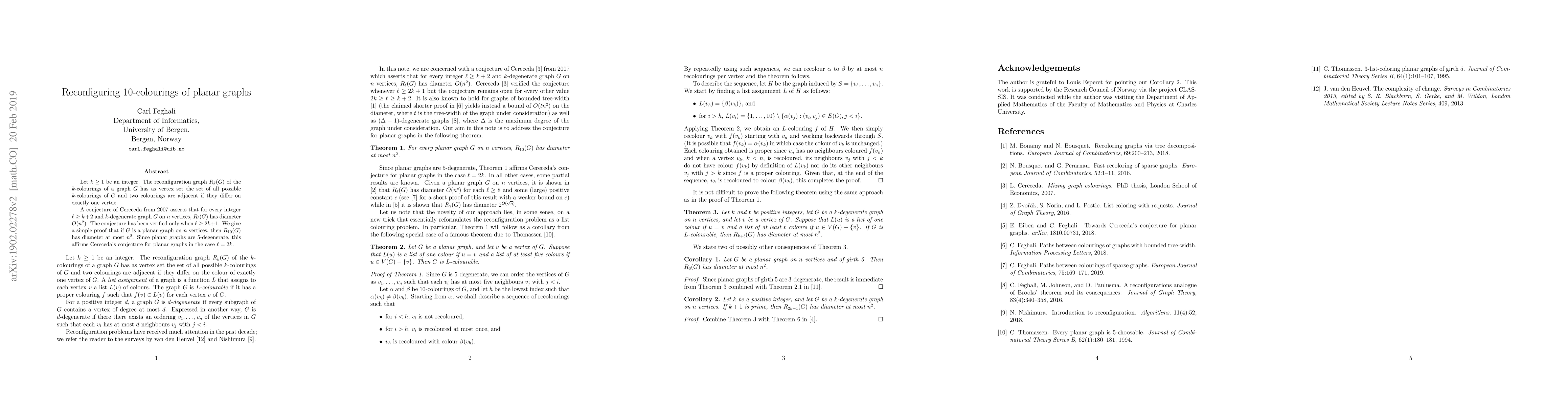 This paper provides a proof that the reconfiguration graph $R_{10}(G)$ for planar graphs $G$ has a diameter of at most $n^2$, confirming Cereceda's conjecture for planar graphs when $\ell = 2k$. This result applies to $k$-degenerate graphs with $\ell \geq 2k + 1$.