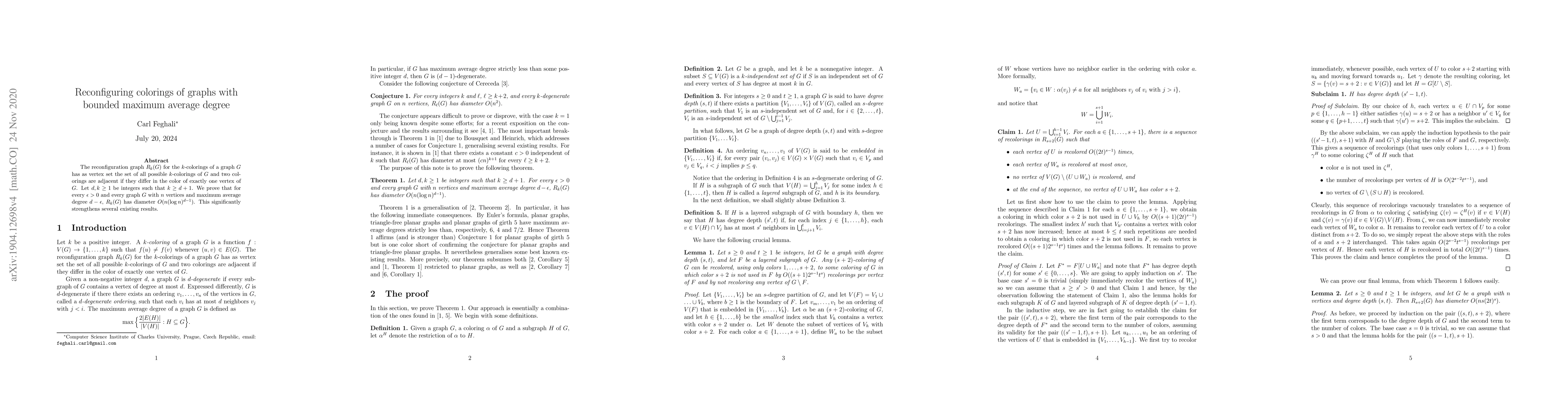 The reconfiguration graph $R_k(G)$ for the $k$-colorings of a graph $G$ has as vertex set the set of all possible $k$-colorings of $G$ and two colorings are adjacent if they differ in the color of exactly one vertex of $G$. Let $d, k \geq 1$ be integers such that $k \geq d+1$. We prove that for every $\epsilon > 0$ and every graph $G$ with $n$ vertices and maximum average degree $d - \epsilon$, $R_k(G)$ has diameter $O(n(\log n)^{d - 1})$. This significantly strengthens several existing results.