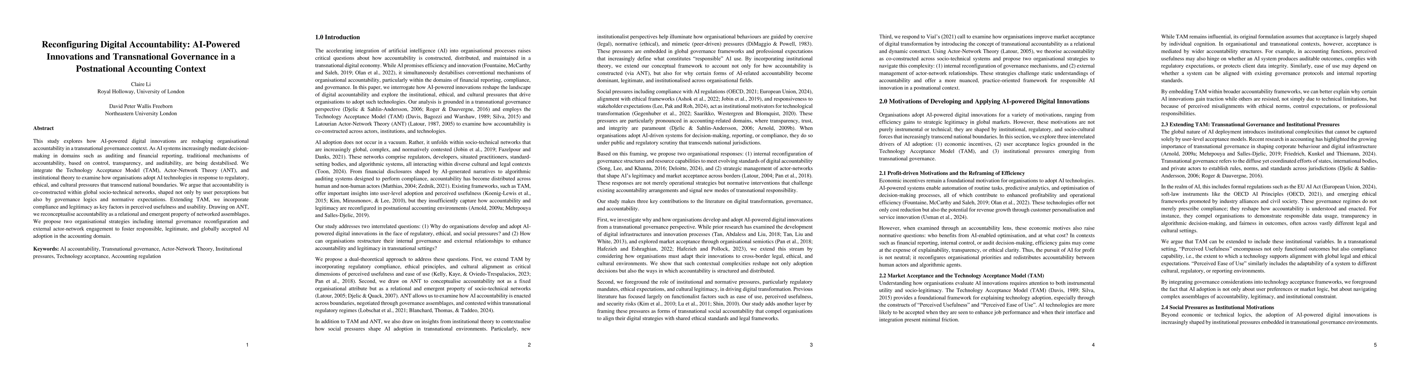 This study explores how AI-powered digital innovations are reshaping organisational accountability in a transnational governance context. As AI systems increasingly mediate decision-making in domains such as auditing and financial reporting, traditional mechanisms of accountability, based on control, transparency, and auditability, are being destabilised. We integrate the Technology Acceptance Model (TAM), Actor-Network Theory (ANT), and institutional theory to examine how organisations adopt AI technologies in response to regulatory, ethical, and cultural pressures that transcend national boundaries. We argue that accountability is co-constructed within global socio-technical networks, shaped not only by user perceptions but also by governance logics and normative expectations. Extending TAM, we incorporate compliance and legitimacy as key factors in perceived usefulness and usability. Drawing on ANT, we reconceptualise accountability as a relational and emergent property of networked assemblages. We propose two organisational strategies including internal governance reconfiguration and external actor-network engagement to foster responsible, legitimate, and globally accepted AI adoption in the accounting domain.