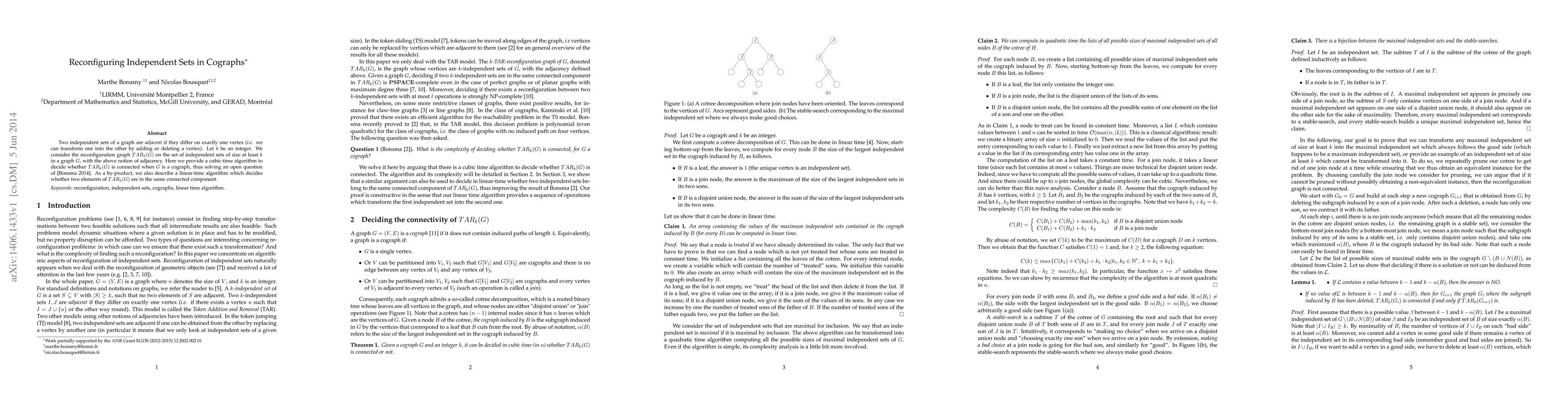 Two independent sets of a graph are adjacent if they differ on exactly one vertex (i.e. we can transform one into the other by adding or deleting a vertex). Let $k$ be an integer. We consider the reconfiguration graph $TAR_k(G)$ on the set of independent sets of size at least $k$ in a graph $G$, with the above notion of adjacency. Here we provide a cubic-time algorithm to decide whether $TAR_k(G)$ is connected when $G$ is a cograph, thus solving an open question of~[Bonsma 2014]. As a by-product, we also describe a linear-time algorithm which decides whether two elements of $TAR_k(G)$ are in the same connected component.