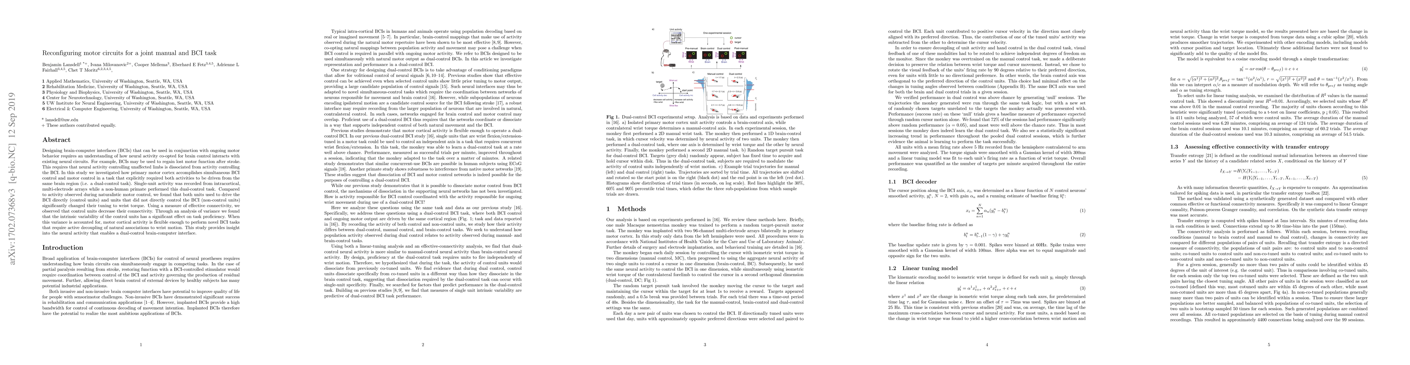 This study explores how the primary motor cortex reconfigures neural circuits to enable simultaneous brain-computer interface (BCI) control and natural motor function in a dual-control task. Findings indicate that both control and non-control units adjust their tuning to wrist torque, and control units show decreased connectivity, highlighting the brain's flexibility in decoupling natural motor associations for BCI tasks.