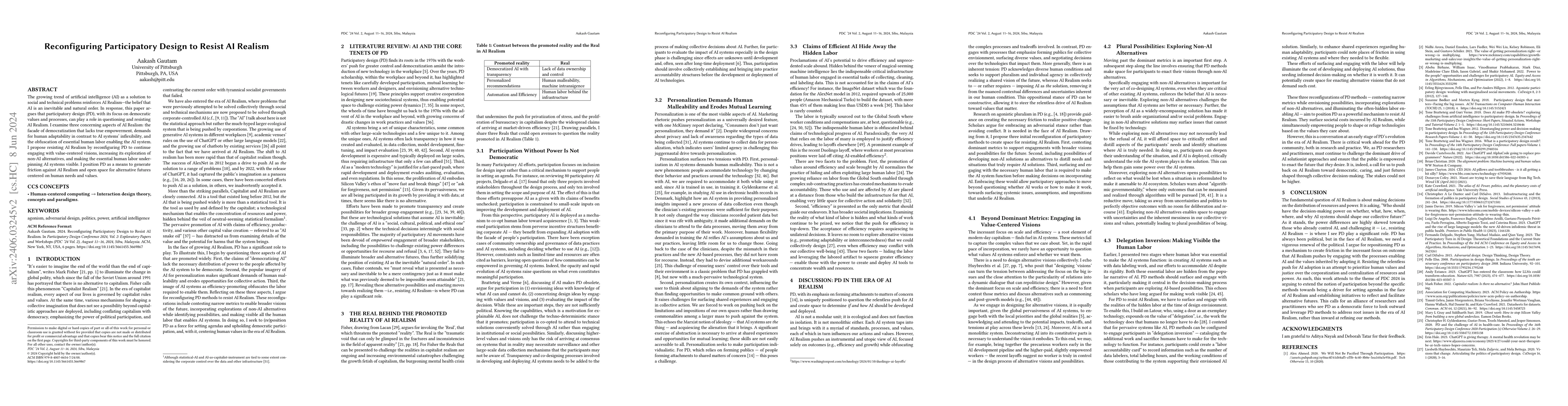 This paper explores how participatory design can challenge the pervasive belief in AI Realism by highlighting the undemocratic aspects of AI, advocating for human adaptability, and making visible the human labor underpinning AI systems. It proposes a reconfiguration of participatory design to foster resistance against AI Realism and promote future solutions centered on human values.
