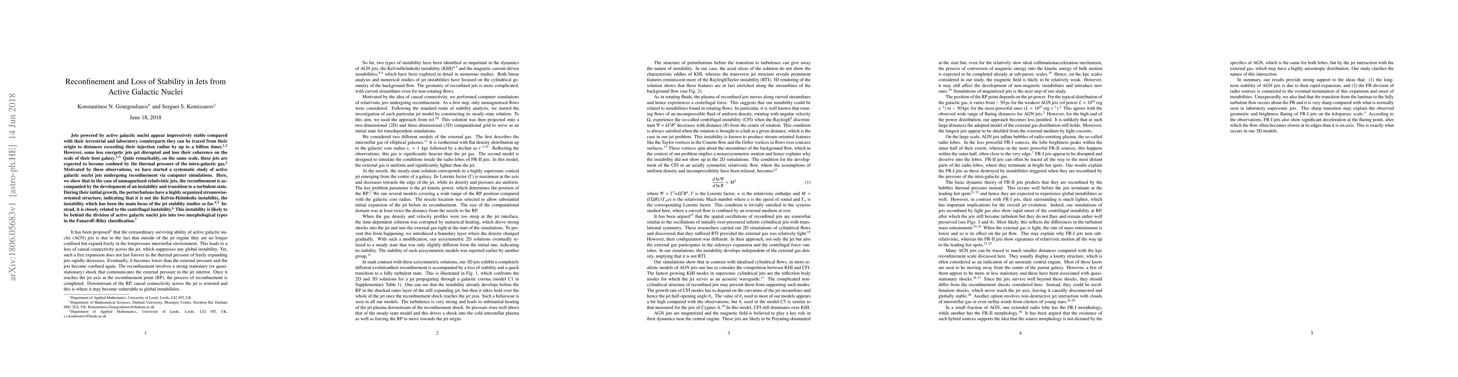 This paper investigates the reconfinement and instability of jets from active galactic nuclei using computer simulations, revealing that unmagnetized relativistic jets undergo a transition to turbulence due to a centrifugal instability rather than the traditionally studied Kelvin-Helmholtz instability, which may explain the morphological classification of these jets.
