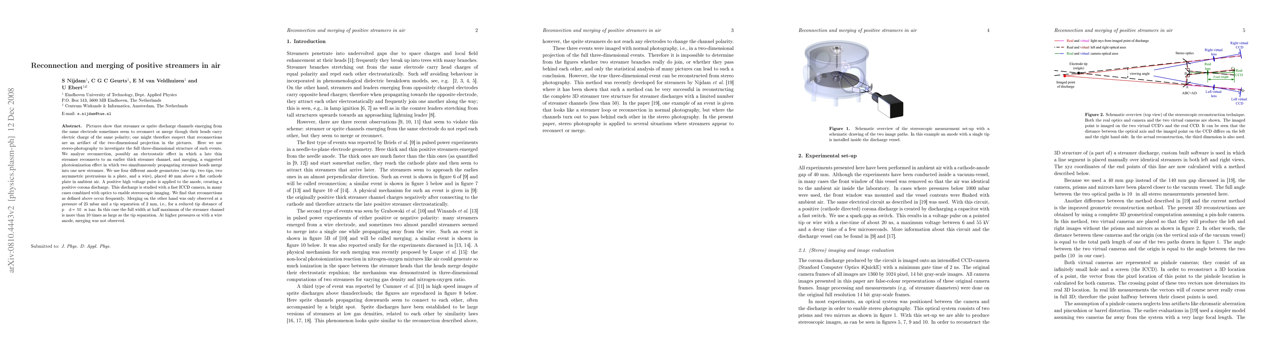 Pictures show that streamer or sprite discharge channels emerging from the same electrode sometimes seem to reconnect or merge though their heads carry electric charge of the same polarity; one might therefore suspect that reconnections are an artifact of the two-dimensional projection in the pictures. Here we use stereo-photography to investigate the full three-dimensional structure of such events. We analyze reconnection, possibly an electrostatic effect in which a late thin streamer reconnects to an earlier thick streamer channel, and merging, a suggested photoionization effect in which two simultaneously propagating streamer heads merge into one new streamer. We use four different anode geometries (one tip, two tips, two asymmetric protrusions in a plate, and a wire), placed 40 mm above a flat cathode plate in ambient air. A positive high voltage pulse is applied to the anode, creating a positive corona discharge. This discharge is studied with a fast ICCD camera, in many cases combined with optics to enable stereoscopic imaging. We find that reconnections as defined above occur frequently. Merging on the other hand was only observed at a pressure of 25 mbar and a tip separation of 2 mm, i.e., for a reduced tip distance of p*d=50 micrometer*bar. In this case the full width at half maximum of the streamer channel is more than 10 times as large as the tip separation. At higher pressures or with a wire anode, merging was not observed.