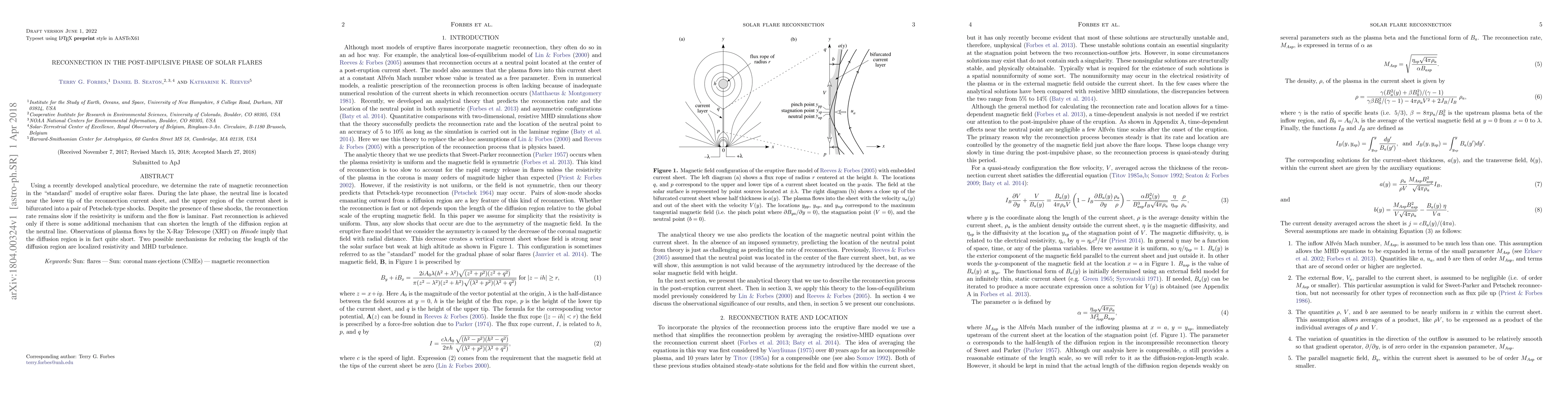 Using a recently developed analytical procedure, we determine the rate of magnetic reconnection in the "standard" model of eruptive solar flares. During the late phase, the neutral line is located near the lower tip of the reconnection current sheet, and the upper region of the current sheet is bifurcated into a pair of Petschek-type shocks. Despite the presence of these shocks, the reconnection rate remains slow if the resistivity is uniform and the flow is laminar. Fast reconnection is achieved only if there is some additional mechanism that can shorten the length of the diffusion region at the neutral line. Observations of plasma flows by the X-Ray Telescope (XRT) on Hinode imply that the diffusion region is in fact quite short. Two possible mechanisms for reducing the length of the diffusion region are localized resistivity and MHD turbulence.