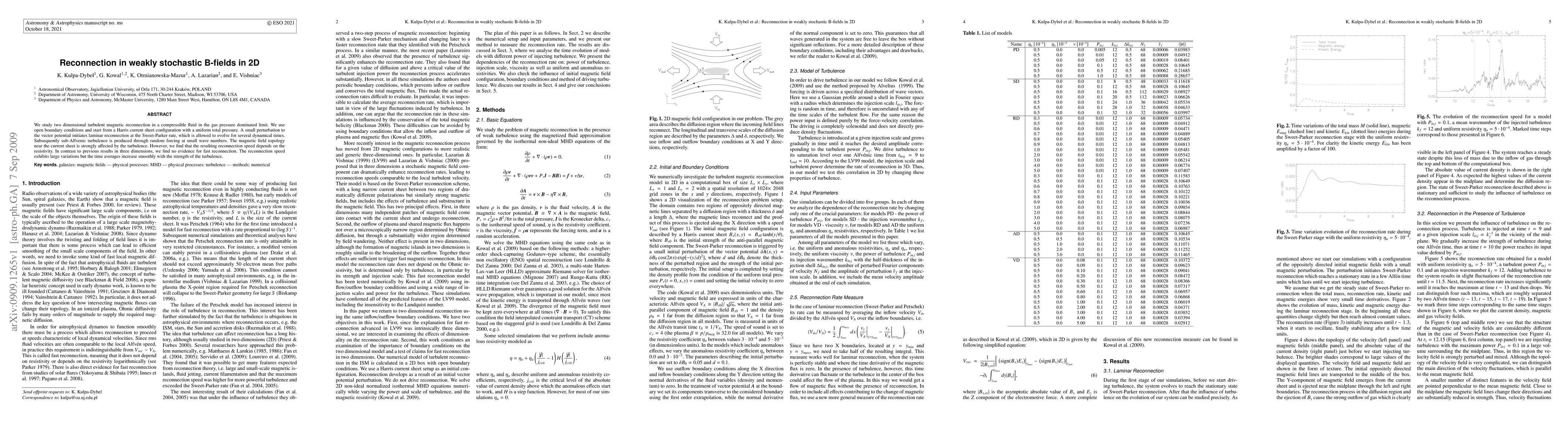This research paper investigates 2D magnetic reconnection in a compressible fluid, finding that reconnection speed depends on resistivity and turbulence strength, with no evidence for fast reconnection.