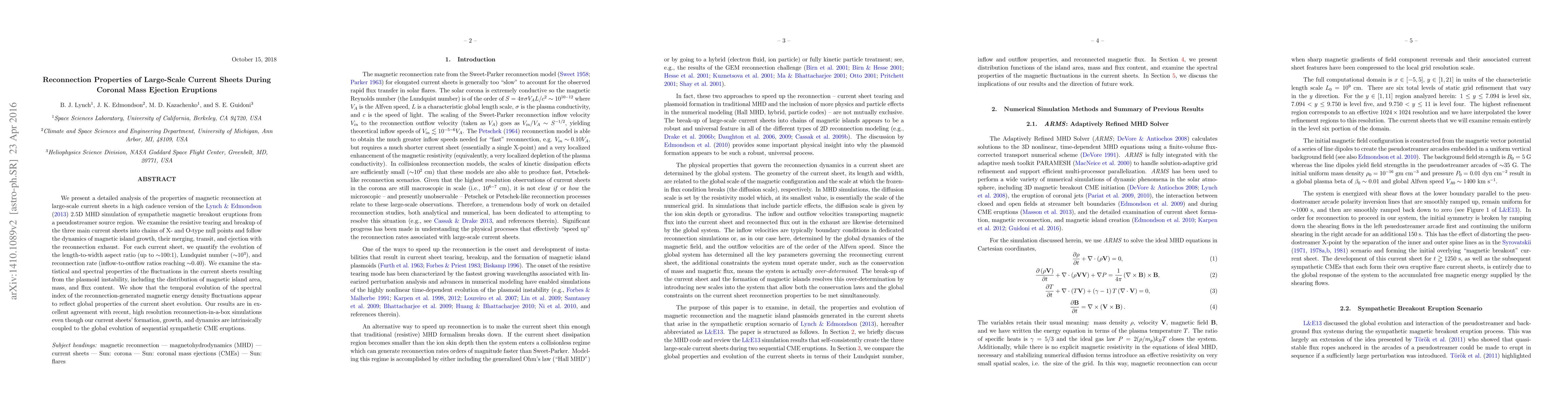 This paper analyzes magnetic reconnection properties in large-scale current sheets during coronal mass ejections using a high-resolution MHD simulation. The study quantifies the evolution of key parameters, such as the length-to-width aspect ratio and reconnection rate, and examines the dynamics of magnetic island formation and their ejection.