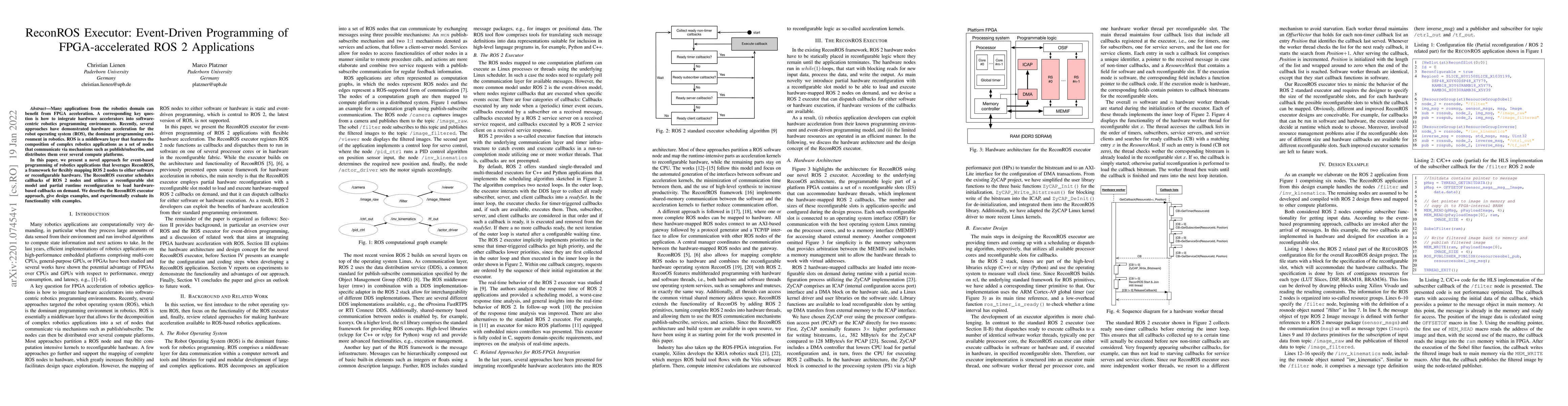 The paper introduces ReconROS executor, a framework for event-driven programming that maps ROS 2 nodes onto software or FPGA hardware, enabling flexible acceleration. The ReconROS executor schedules callbacks and utilizes partial reconfiguration for on-demand hardware-based callbacks, demonstrated through design examples and experimental evaluations.