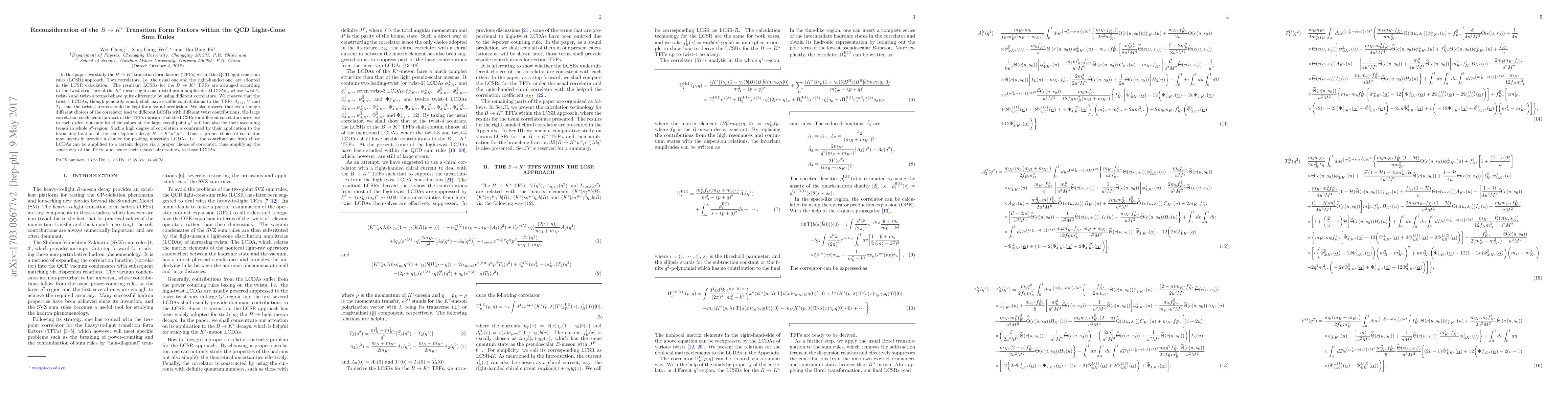 In this paper, we study the $B \to K^*$ transition form factors (TFFs) within the QCD light-cone sum rules (LCSR) approach. Two correlators, i.e. the usual one and the right-handed one, are adopted in the LCSR calculation. The resultant LCSRs for the $B \to K^*$ TFFs are arranged according to the twist structure of the $K^*$-meson light-cone distribution amplitudes (LCDAs), whose twist-2, twist-3 and twist-4 terms behave quite differently by using different correlators. We observe that the twist-4 LCDAs, though generally small, shall have sizable contributions to the TFFs $A_{1/2}$, $V$ and $T_1$, thus the twist-4 terms should be kept for a sound prediction. We also observe that even though different choices of the correlator lead to different LCSRs with different twist contributions, the large correlation coefficients for most of the TFFs indicate that the LCSRs for different correlators are close to each order, not only for their values at the large recoil point $q^2=0$ but also for their ascending trends in whole $q^2$-region. Such a high degree of correlation is confirmed by their application to the branching fraction of the semi-leptonic decay $B \to K^* \mu^+ \mu^-$. Thus, a proper choice of correlator may inversely provide a chance for probing uncertain LCDAs, i.e. the contributions from those LCDAs can be amplified to a certain degree via a proper choice of correlator, thus amplifying the sensitivity of the TFFs, and hence their related observables, to those LCDAs.
