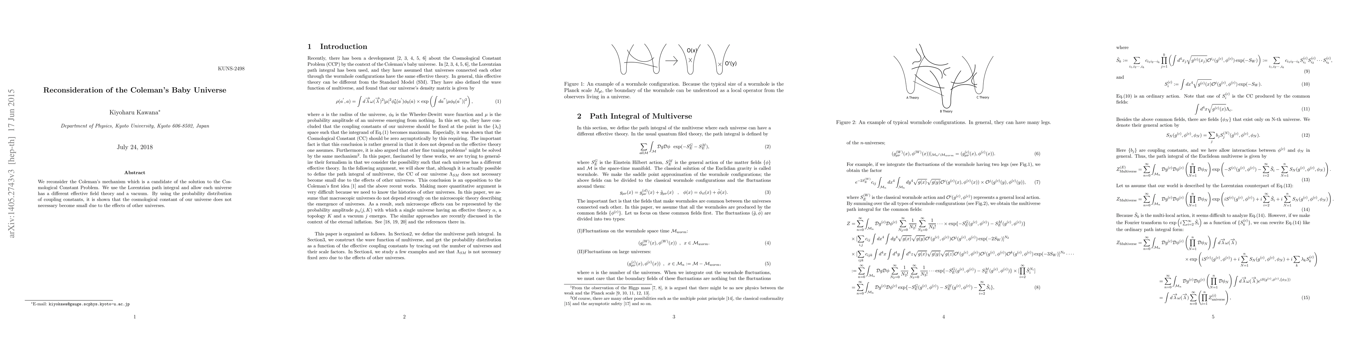 We reconsider the Coleman's mechanism that solves the Cosmological Constant Problem by the baby universes. We use the Lorentzian path integral and allow each universe has a different effective field theory and a vacuum. By using the probability distribution of coupling constants, it is shown that the cosmological constant of our universe does not necessary become small due to the effects of other universes.