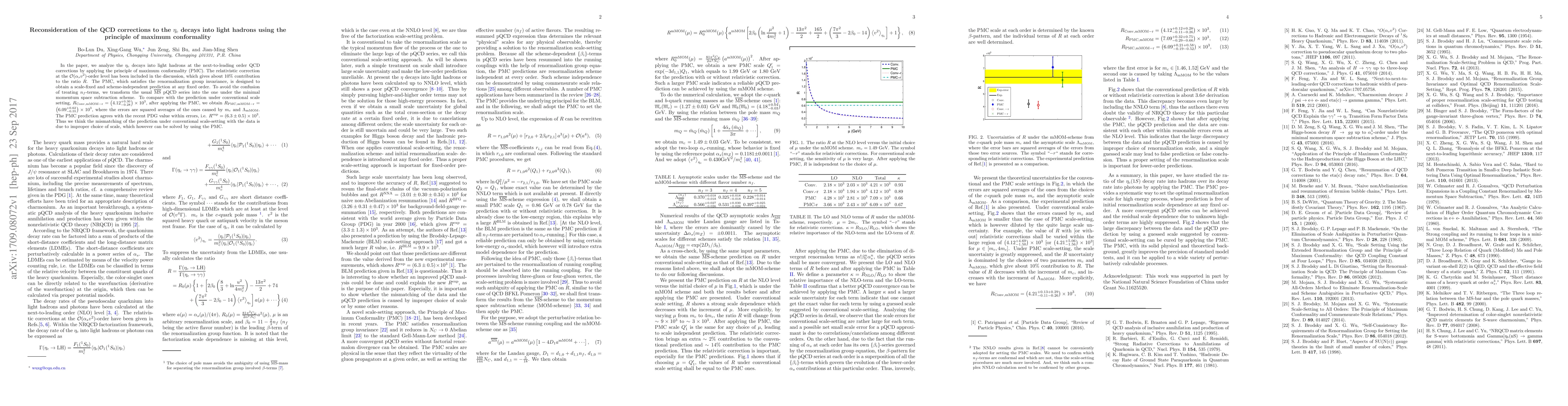 In the paper, we analyze the $\eta_c$ decays into light hadrons at the next-to-leading order QCD corrections by applying the principle of maximum conformality (PMC). The relativistic correction at the ${\cal{O}}(\alpha_s v^2)$-order level has been included in the discussion, which gives about $10\%$ contribution to the ratio $R$. The PMC, which satisfies the renormalization group invariance, is designed to obtain a scale-fixed and scheme-independent prediction at any fixed order. To avoid the confusion of treating $n_f$-terms, we transform the usual $\overline{\rm MS}$ pQCD series into the one under the minimal momentum space subtraction scheme. To compare with the prediction under conventional scale setting, $R_{\rm{Conv,mMOM}-r}= \left(4.12^{+0.30}_{-0.28}\right)\times10^3$, after applying the PMC, we obtain $R_{\rm PMC,mMOM-r}=\left(6.09^{+0.62}_{-0.55}\right) \times10^3$, where the errors are squared averages of the ones caused by $m_c$ and $\Lambda_{\rm mMOM}$. The PMC prediction agrees with the recent PDG value within errors, i.e. $R^{\rm exp}=\left(6.3\pm0.5\right)\times10^3$. Thus we think the mismatching of the prediction under conventional scale-setting with the data is due to improper choice of scale, which however can be solved by using the PMC.
