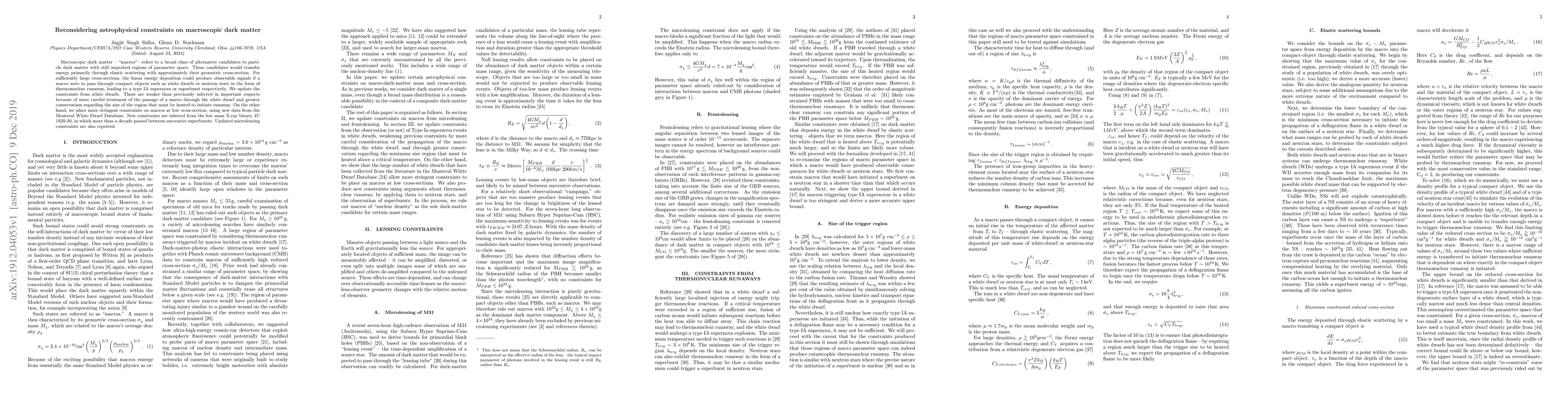 This paper updates astrophysical constraints on macroscopic dark matter (macros), finding that constraints from white dwarfs are weaker due to more careful analysis, while new data tightens constraints at low cross-sections. Additionally, constraints from microlensing and observations of the low mass X-ray binary 4U 1820-30 are also refined.