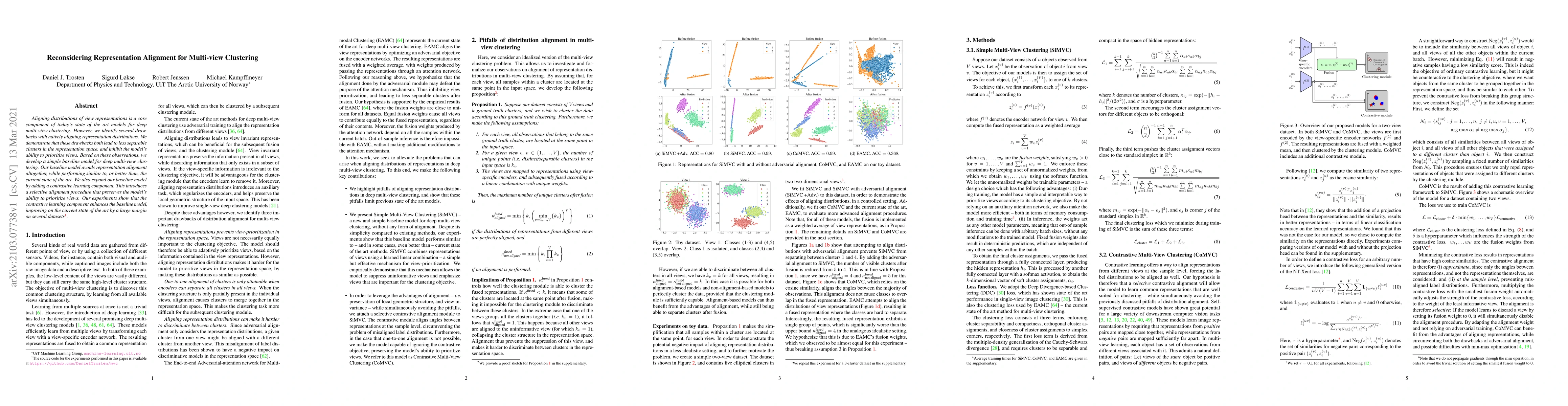 Researchers develop a new approach for multi-view clustering that avoids aligning representation distributions, achieving similar performance to state-of-the-art models, and improves upon them with the addition of a contrastive learning component.