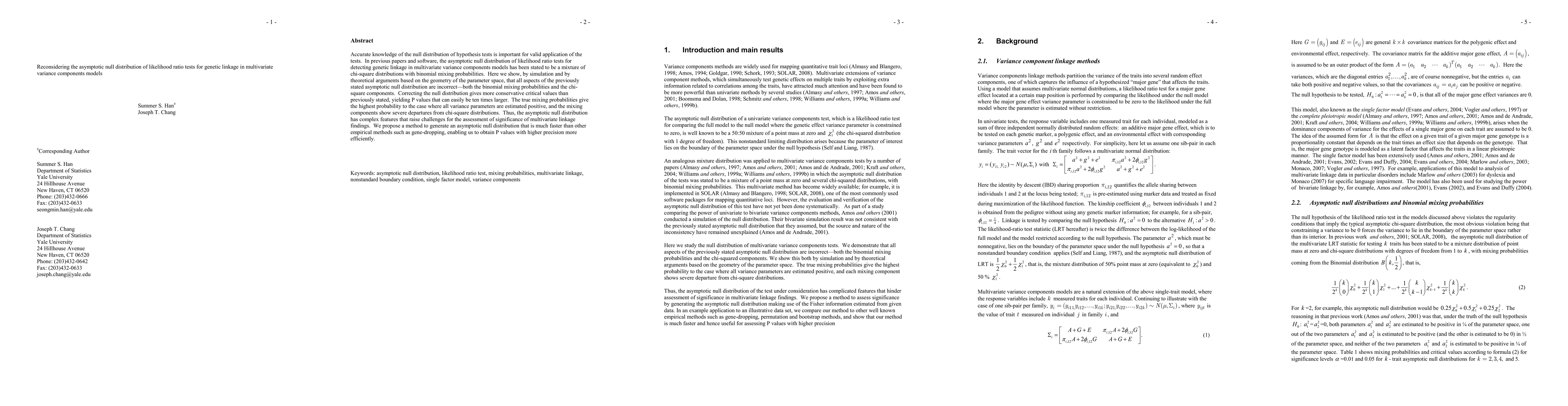 Accurate knowledge of the null distribution of hypothesis tests is important for valid application of the tests. In previous papers and software, the asymptotic null distribution of likelihood ratio tests for detecting genetic linkage in multivariate variance components models has been stated to be a mixture of chi-square distributions with binomial mixing probabilities. Here we show, by simulation and by theoretical arguments based on the geometry of the parameter space, that all aspects of the previously stated asymptotic null distribution are incorrect--both the binomial mixing probabilities and the chi-square components. Correcting the null distribution gives more conservative critical values than previously stated, yielding P values that can easily be ten times larger. The true mixing probabilities give the highest probability to the case where all variance parameters are estimated positive, and the mixing components show severe departures from chi-square distributions. Thus, the asymptotic null distribution has complex features that raise challenges for the assessment of significance of multivariate linkage findings. We propose a method to generate an asymptotic null distribution that is much faster than other empirical methods such as gene-dropping, enabling us to obtain P values with higher precision more efficiently.