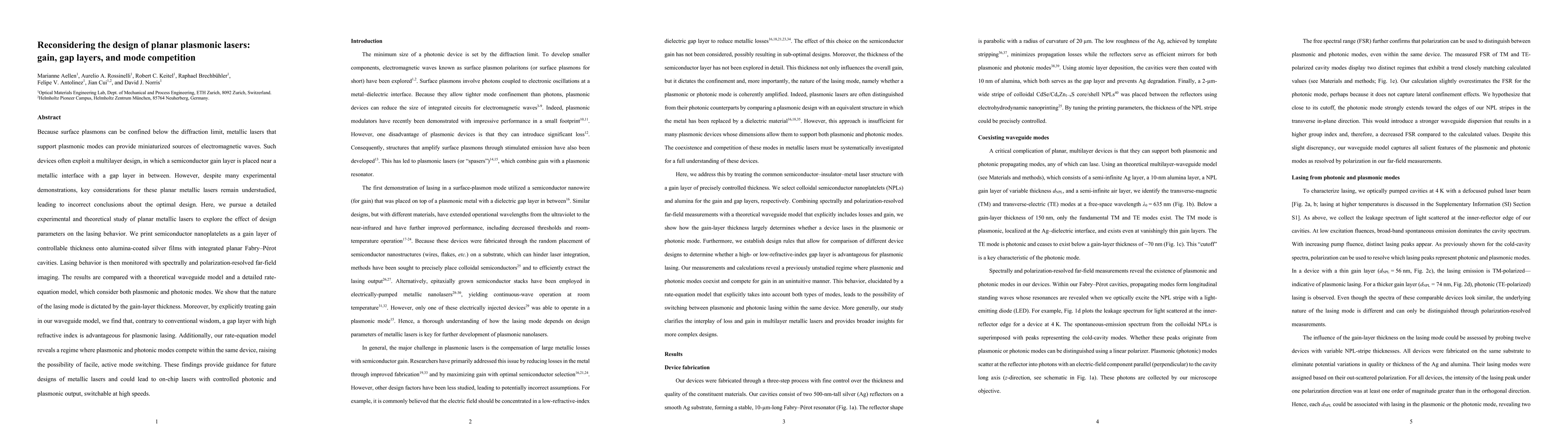 Because surface plasmons can be confined below the diffraction limit, metallic lasers that support plasmonic modes can provide miniaturized sources of electromagnetic waves. Such devices often exploit a multilayer design, in which a semiconductor gain layer is placed near a metallic interface with a gap layer in between. However, despite many experimental demonstrations, key considerations for these planar metallic lasers remain understudied, leading to incorrect conclusions about the optimal design. Here, we pursue a detailed experimental and theoretical study of planar metallic lasers to explore the effect of design parameters on the lasing behavior. We print semiconductor nanoplatelets as a gain layer of controllable thickness onto alumina-coated silver films with integrated planar Fabry-P\'erot cavities. Lasing behavior is then monitored with spectrally and polarization-resolved far-field imaging. The results are compared with a theoretical waveguide model and a detailed rate-equation model, which consider both plasmonic and photonic modes. We show that the nature of the lasing mode is dictated by the gain-layer thickness. Moreover, by explicitly treating gain in our waveguide model, we find that, contrary to conventional wisdom, a gap layer with high refractive index is advantageous for plasmonic lasing. Additionally, our rate-equation model reveals a regime where plasmonic and photonic modes compete within the same device, raising the possibility of facile, active mode switching. These findings provide guidance for future designs of metallic lasers and could lead to on-chip lasers with controlled photonic and plasmonic output, switchable at high speeds.