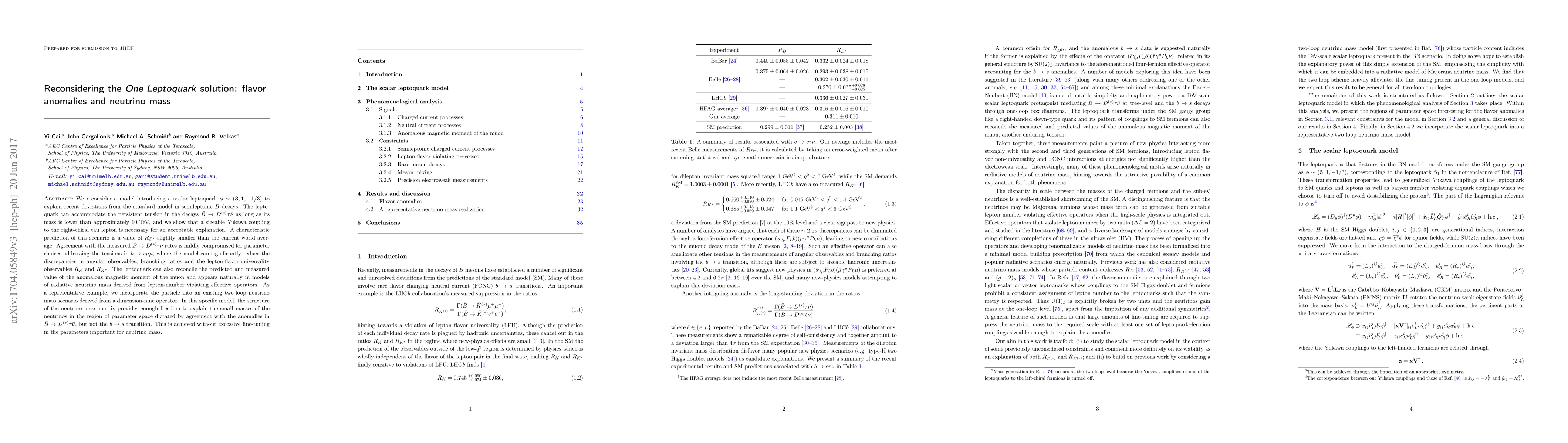 We reconsider a model introducing a scalar leptoquark $\phi \sim (\mathbf{3}, \mathbf{1}, -1/3)$ to explain recent deviations from the standard model in semileptonic $B$ decays. The leptoquark can accommodate the persistent tension in the decays $\bar{B}\rightarrow D^{(*)}\tau \bar{\nu}$ as long as its mass is lower than approximately $10 \text{ TeV}$, and we show that a sizeable Yukawa coupling to the right-chiral tau lepton is necessary for an acceptable explanation. Agreement with the measured $\bar{B}\rightarrow D^{(*)}\tau \bar{\nu}$ rates is mildly compromised for parameter choices addressing the tensions in $b \to s \mu \mu$, where the model can significantly reduce the discrepancies in angular observables, branching ratios and the lepton-flavor-universality observables $R_K$ and $R_{K^*}$. The leptoquark can also reconcile the predicted and measured value of the anomalous magnetic moment of the muon and appears naturally in models of radiative neutrino mass derived from lepton-number violating effective operators. As a representative example, we incorporate the particle into an existing two-loop neutrino mass scenario derived from a dimension-nine operator. In this specific model, the structure of the neutrino mass matrix provides enough freedom to explain the small masses of the neutrinos in the region of parameter space dictated by agreement with the anomalies in $\bar{B}\rightarrow D^{(*)}\tau \bar{\nu}$, but not the $b \to s$ transition. This is achieved without excessive fine-tuning in the parameters important for neutrino mass.