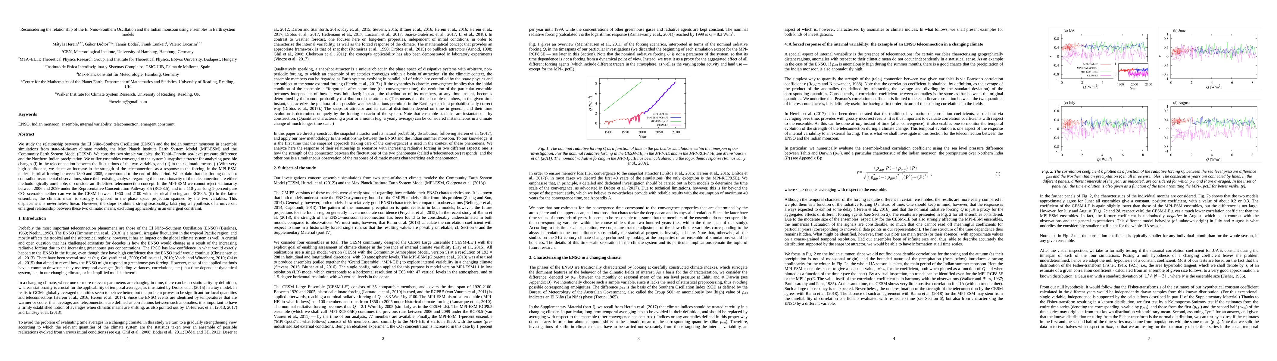We study the relationship between the El Ni\~no--Southern Oscillation (ENSO) and the Indian summer monsoon in ensemble simulations from state-of-the-art climate models, the Max Planck Institute Earth System Model (MPI-ESM) and the Community Earth System Model (CESM). We consider two simple variables: the Tahiti--Darwin sea-level pressure difference and the Northern Indian precipitation. We utilize ensembles converged to the system's snapshot attractor for analyzing possible changes (i) in the teleconnection between the fluctuations of the two variables, and (ii) in their climatic means. (i) With very high confidence, we detect an increase in the strength of the teleconnection, as a response to the forcing, in the MPI-ESM under historical forcing between 1890 and 2005, concentrated to the end of this period. We explain that our finding does not contradict instrumental observations, since their existing analyses regarding the nonstationarity of the teleconnection are either methodologically unreliable, or consider an ill-defined teleconnection concept. In the MPI-ESM we cannot reject stationarity between 2006 and 2099 under the Representative Concentration Pathway 8.5 (RCP8.5), and in a 110-year-long 1-percent pure CO2 scenario; neither can we in the CESM between 1960 and 2100 with historical forcing and RCP8.5. (ii) In the latter ensembles, the climatic mean is strongly displaced in the phase space projection spanned by the two variables. This displacement is nevertheless linear. However, the slope exhibits a strong seasonality, falsifying a hypothesis of a universal, emergent relationship between these two climatic means, excluding applicability in an emergent constraint.
