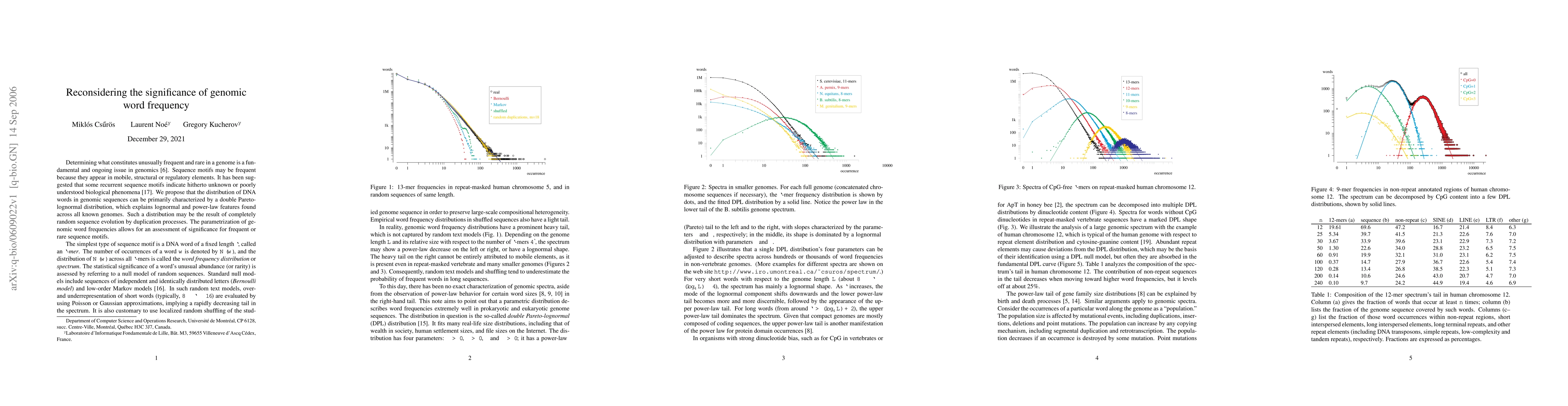 We propose that the distribution of DNA words in genomic sequences can be primarily characterized by a double Pareto-lognormal distribution, which explains lognormal and power-law features found across all known genomes. Such a distribution may be the result of completely random sequence evolution by duplication processes. The parametrization of genomic word frequencies allows for an assessment of significance for frequent or rare sequence motifs.