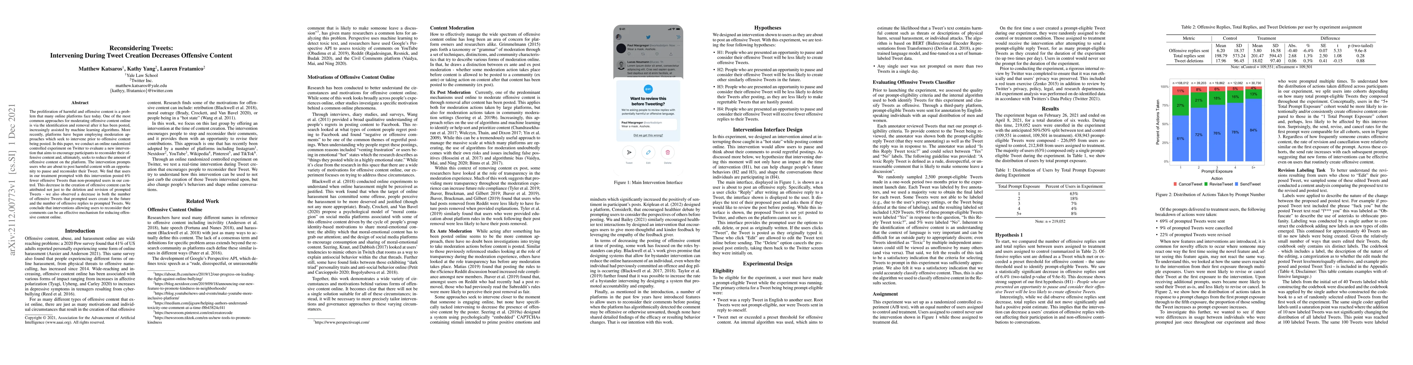 This study evaluates an intervention on Twitter that prompts users to reconsider offensive content before posting, finding a 6% reduction in offensive Tweets among prompted users. The intervention not only decreases immediate offensive posts but also reduces future offensive Tweets and replies, suggesting that encouraging reconsideration can effectively lower harmful online content.