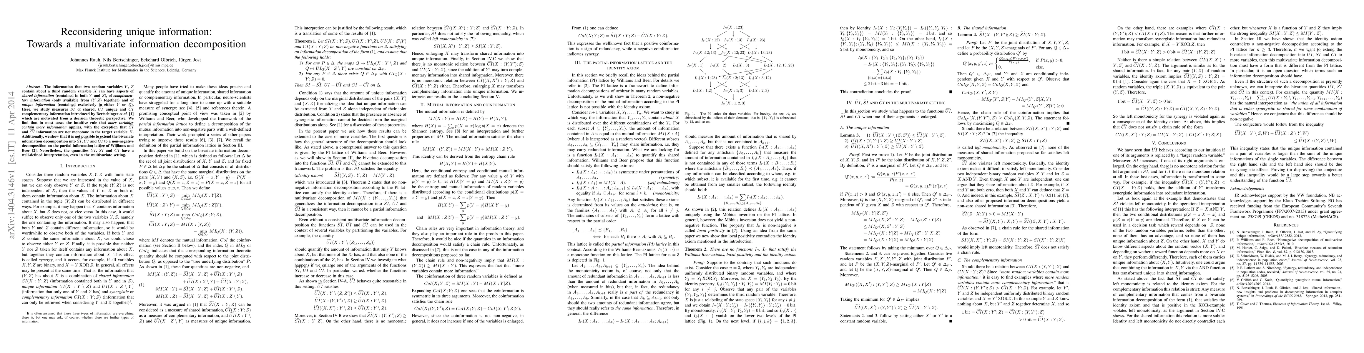 This paper examines measures of shared, unique, and complementary information between random variables, finding that while more variables generally contain more information, shared and complementary information are not always monotone. It also concludes that these measures cannot be extended to a non-negative decomposition in multivariate settings.
