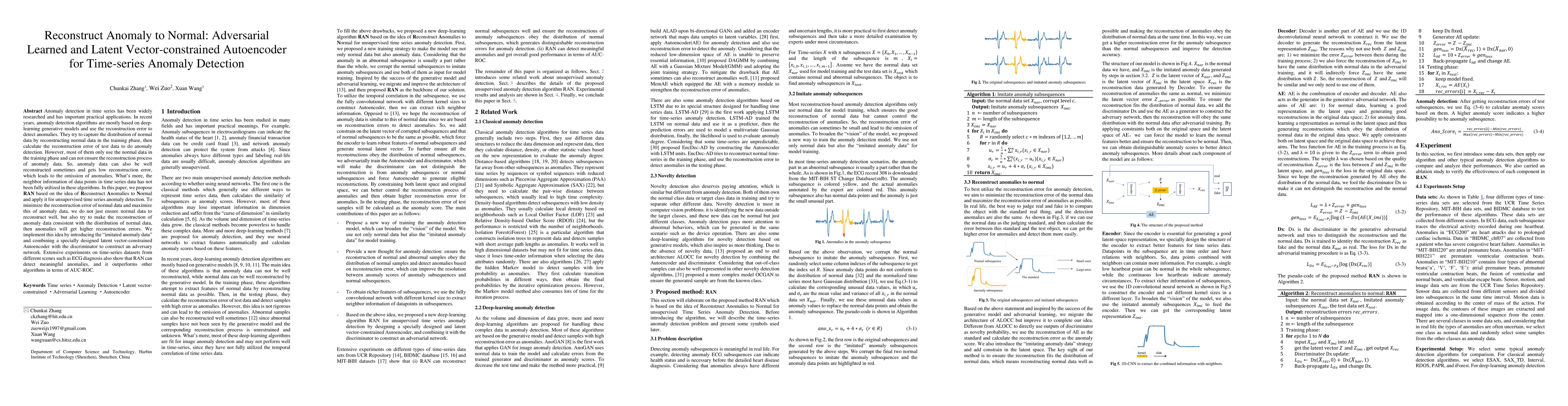 This paper proposes RAN, an adversarial learned and latent vector-constrained Autoencoder for time-series anomaly detection, aiming to minimize normal data reconstruction errors and maximize anomaly data reconstruction errors. The method introduces "imitated anomaly data" and an adversarial network to better distinguish anomalies, outperforming other algorithms in AUC-ROC metrics.
