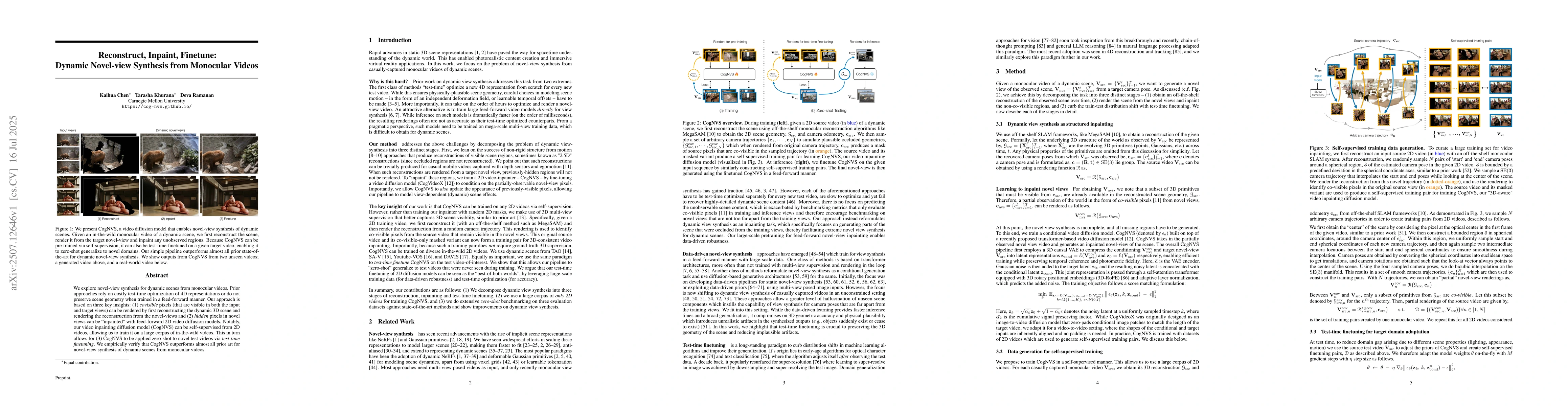The paper introduces CogNVS, a self-supervised video inpainting diffusion model that combines large-scale pretraining and test-time finetuning for dynamic novel-view synthesis from monocular videos, outperforming prior art and addressing limitations of existing methods.