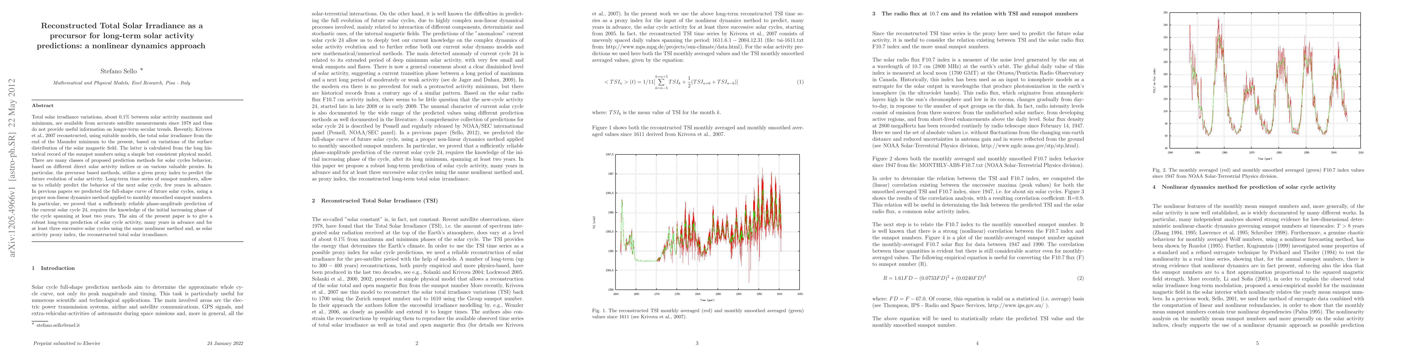 This paper reconstructs total solar irradiance from historical sunspot data to model long-term solar activity trends. It uses a nonlinear dynamics approach to predict the behavior of solar cycles several years in advance, demonstrating that the initial phase of the cycle is crucial for accurate predictions.