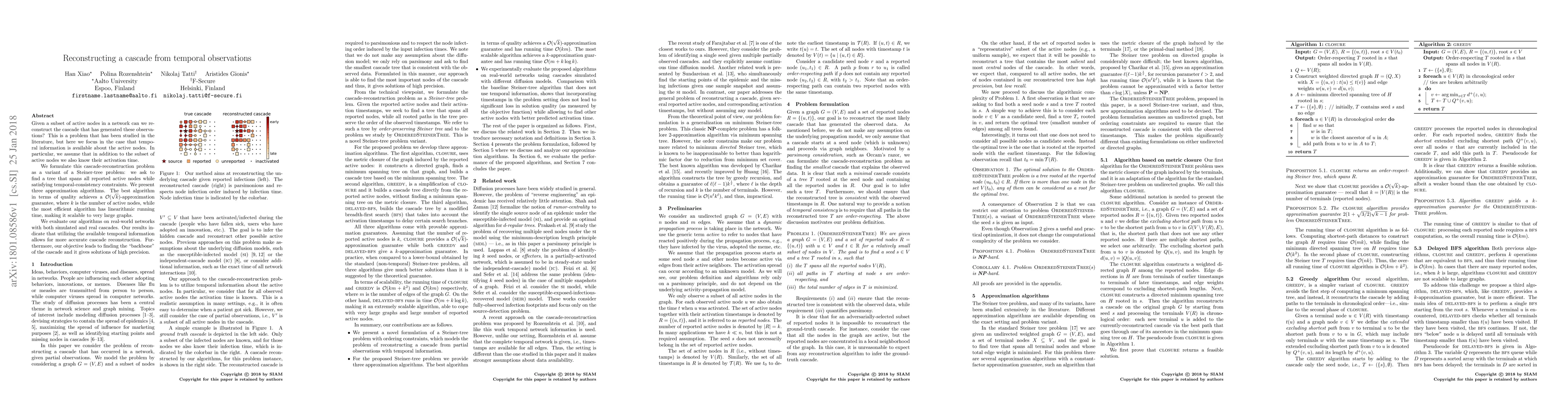 Given a subset of active nodes in a network can we re- construct the cascade that has generated these observa- tions? This is a problem that has been studied in the literature, but here we focus in the case that tempo- ral information is available about the active nodes. In particular, we assume that in addition to the subset of active nodes we also know their activation time. We formulate this cascade-reconstruction problem as a variant of a Steiner-tree problem: we ask to find a tree that spans all reported active nodes while satisfying temporal-consistency constraints. We present three approximation algorithms. The best algorithm in terms of quality achieves a O(\sqrt{k})-approximation guarantee, where k is the number of active nodes, while the most efficient algorithm has linearithmic running time, making it scalable to very large graphs. We evaluate our algorithms on real-world networks with both simulated and real cascades. Our results in- dicate that utilizing the available temporal information allows for more accurate cascade reconstruction. Fur- thermore, our objective leads to finding the "backbone" of the cascade and it gives solutions of high precision.