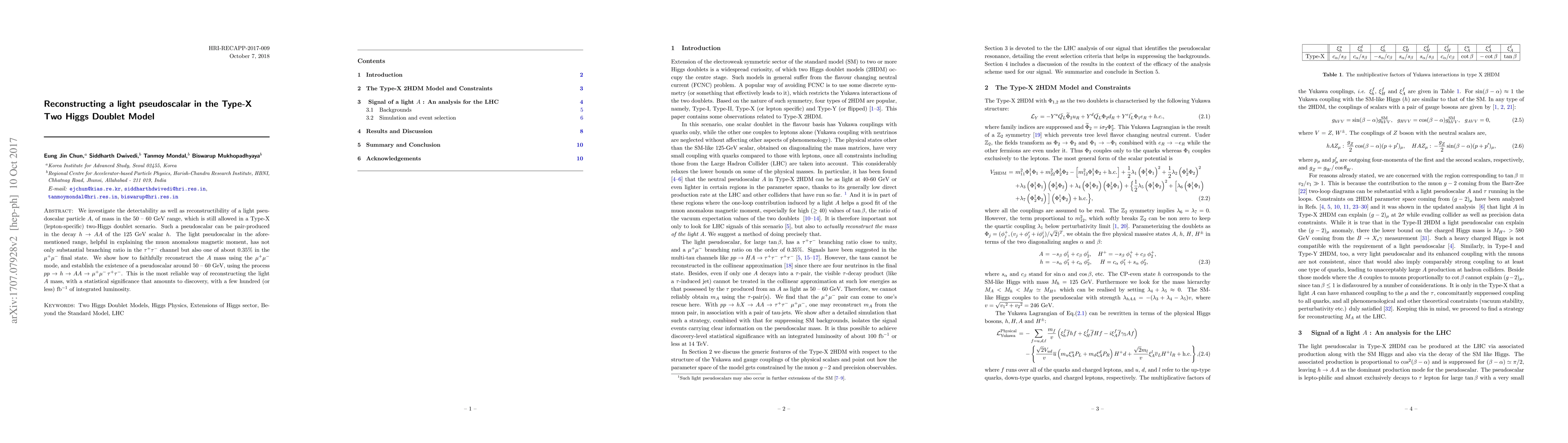 We investigate the detectability as well as reconstructibility of a light pseudoscalar particle $A$, of mass in the 50 - 60 GeV range, which is still allowed in a Type-X (lepton-specific) two-Higgs doublet scenario. Such a pseudoscalar can be pair-produced in the decay $h\to AA$ of the 125 GeV scalar $h$. The light pseudoscalar in the aforementioned range, helpful in explaining the muon anomalous magnetic moment, has not only substantial branching ratio in the $\tau^+\tau^-$ channel but also one of about $0.35\%$ in the $\mu^+\mu^-$ final state. We show how to faithfully reconstruct the $A$ mass using the $\mu^+\mu^-$ mode, and establish the existence of a pseudoscalar around 50 - 60 GeV, using the process $pp\to h \to AA\to \mu^+\mu^-\,\tau^+\tau^-$. This is the most reliable way of reconstructing the light $A$ mass, and is possible for an integrated luminosity of about $100~\rm{fb}^{-1}$ or less at 14 TeV, with a statistical significance that amounts to discovery.