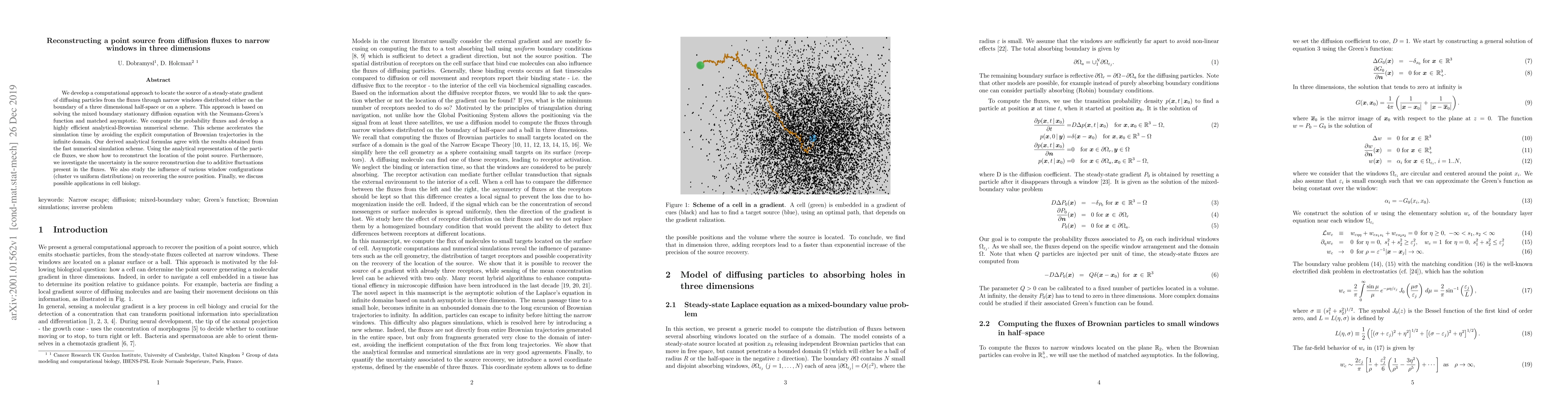 We develop a computational approach to locate the source of a steady-state gradient of diffusing particles from the fluxes through narrow windows distributed either on the boundary of a three dimensional half-space or on a sphere. This approach is based on solving the mixed boundary stationary diffusion equation with the Neumann-Green's function and matched asymptotic. We compute the probability fluxes and develop a highly efficient analytical-Brownian numerical scheme. This scheme accelerates the simulation time by avoiding the explicit computation of Brownian trajectories in the infinite domain. Our derived analytical formulas agree with the results obtained from the fast numerical simulation scheme. Using the analytical representation of the particle fluxes, we show how to reconstruct the location of the point source. Furthermore, we investigate the uncertainty in the source reconstruction due to additive fluctuations present in the fluxes. We also study the influence of various window configurations (cluster vs uniform distributions) on recovering the source position.