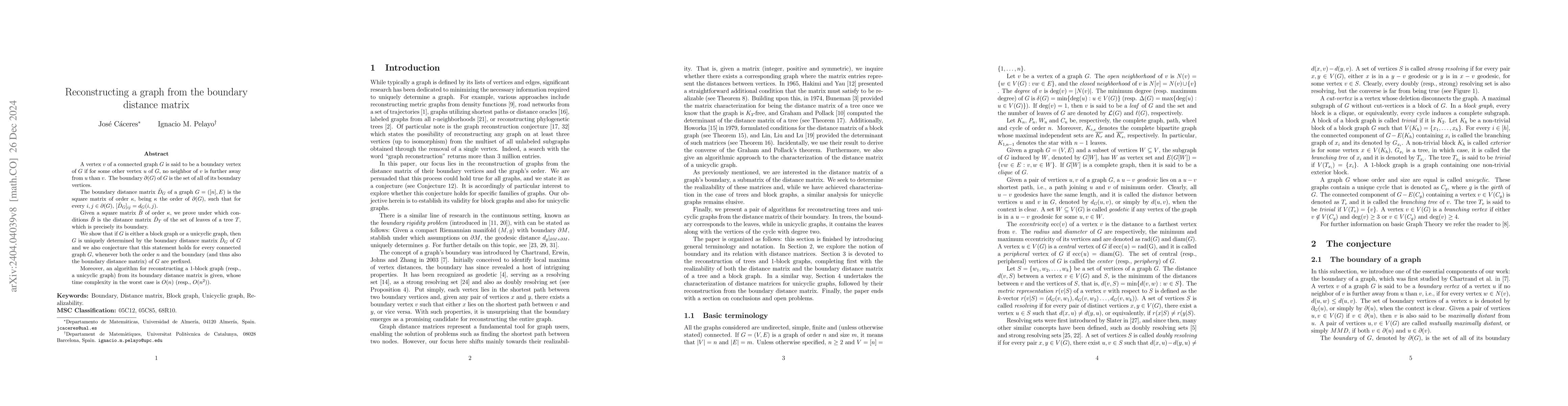 A vertex $v$ of a connected graph $G$ is said to be a boundary vertex of $G$ if for some other vertex $u$ of $G$, no neighbor of $v$ is further away from $u$ than $v$. The boundary $\partial(G)$ of $G$ is the set of all of its boundary vertices. The distance matrix $\hat{D}_G$ of the boundary of a graph $G$ is the square matrix of order $\kappa$, being $\kappa$ the order of $\partial(G)$, such that for every $i,j\in \partial(G)$, $[\hat{D}_G]_{ij}=d_G(i,j)$. Given a square matrix $\hat{B}$ of order $\kappa$, we prove under which conditions $\hat{B}$ is the distance matrix $\hat{D}_T$ of the set of leaves of a tree $T$, which is precisely its boundary. We show that if $G$ is either a tree or a unicyclic graph with girth $g\geq 5$ vertices, then $G$ is uniquely determined by the distance matrix $\hat{D}_{G}$ of the boundary of $G$ and we also conjecture that this statement holds for every connected graph. Moreover, two algorithms for reconstructing a tree and a unicyclic graph from the distance matrix of their boundaries are given, whose time complexities in the worst case are, respectively, $O(\kappa n)$ and $O(n^2)$.