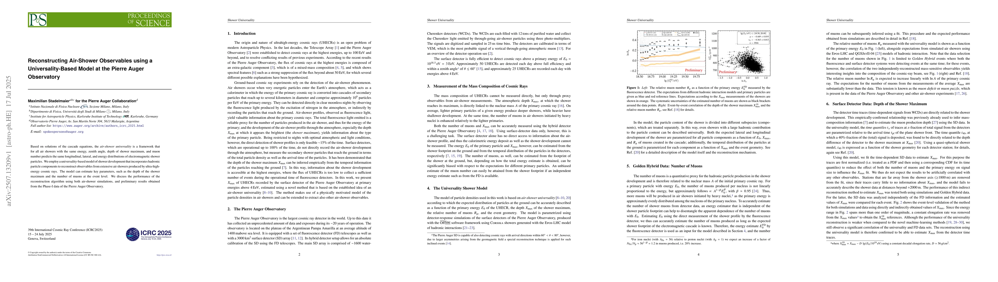 The paper presents a universality-based shower model for reconstructing air-shower observables, including depth of shower maximum and muon number, without requiring event-level fluorescence detector data for the latter.