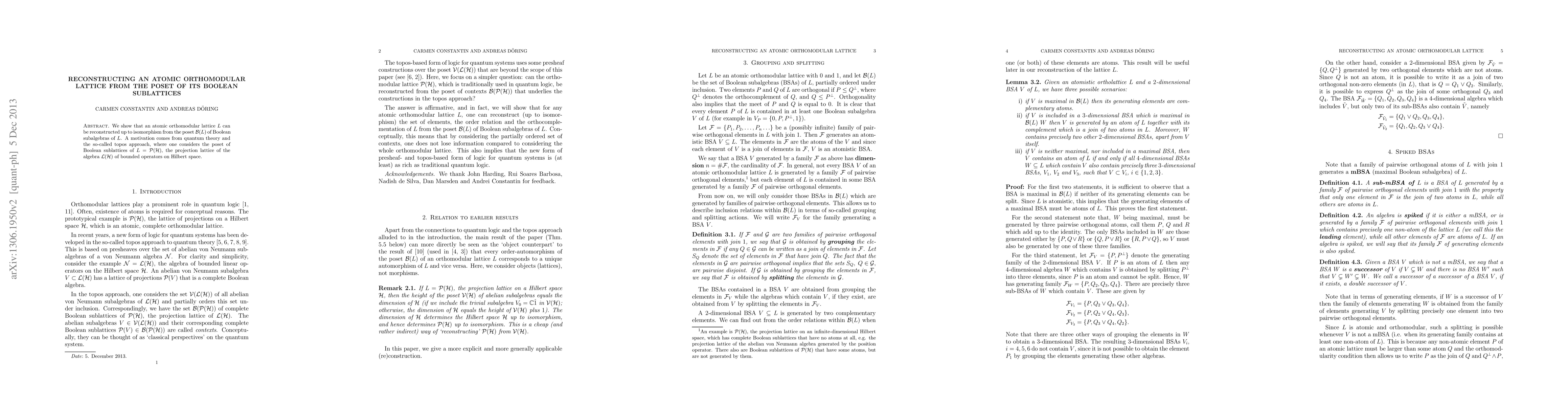 The research demonstrates that an atomic orthomodular lattice can be uniquely reconstructed from the poset of its Boolean sublattices, aiding quantum theory interpretation, particularly in the topos approach involving projection lattices of bounded operators on Hilbert space.