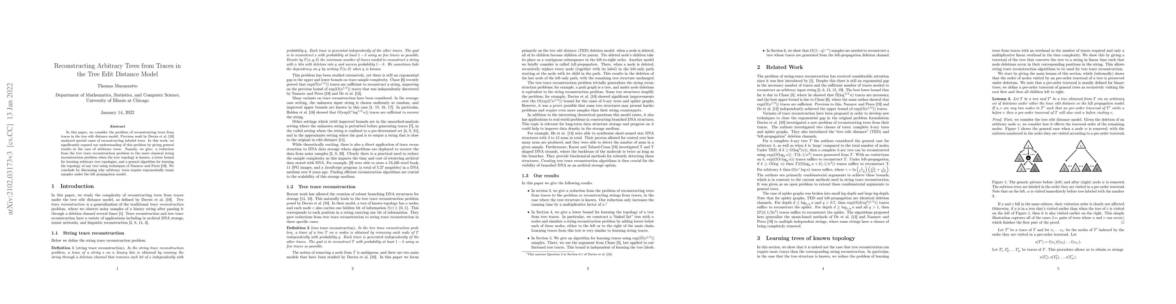 This paper reconstructs arbitrary trees from traces in the tree edit distance model, expanding on previous work that focused on labeled trees. It provides a reduction to the string reconstruction problem, a lower bound for learning tree topologies, and a general algorithm for tree topology learning, concluding that arbitrary trees require exponentially many samples under the left propagation model.